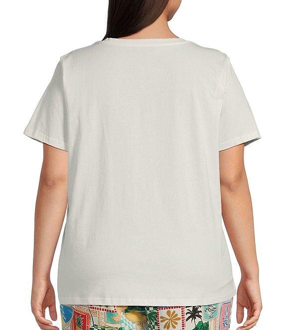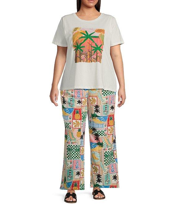 From Skies Are Blue Plus, this t-shirt features: Round neckline Short sleeves Scenic palm tree graphic on the front Pullover styling Cotton Hand wash/line dry Imported.