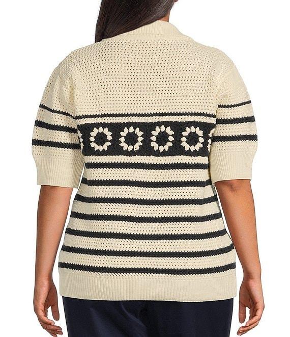 Skies Are Blue Plus Printed Pointelle Knit Collared Short Sleeve Sweater