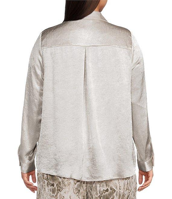 Skies Are Blue Plus Size Collared V-Neck Long Sleeve Crinkled Satin Button Down Blouse
