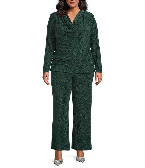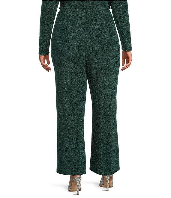 From Skies Are Blue Plus, these pants feature: Lurex knit fabrication High waist Wide leg Pull-on construction Approx. 30" inseam, 14.375" leg opening Rayon/polyester/spandex Hand wash Imported.