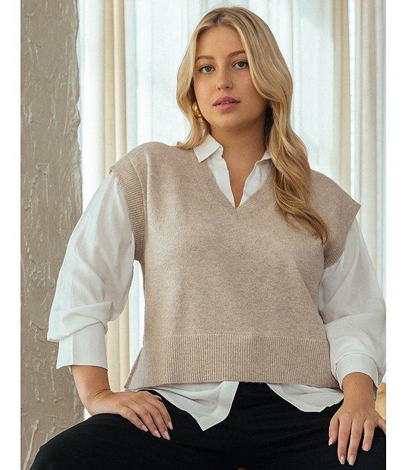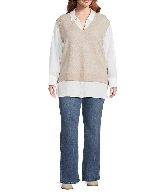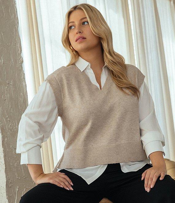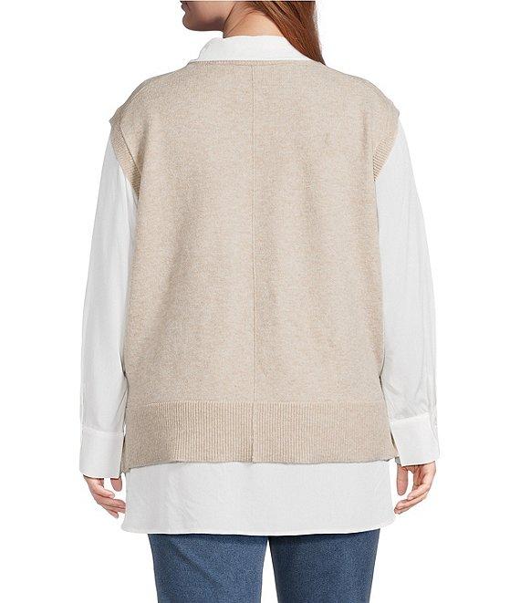 From Skies Are Blue Plus, this two-fer top features: Has the look of two pieces Woven collar, long sleeves and hem Sweater knit sleeveless v-neck body with side-vents at the hem Button closures at the sleeve openings Pullover styling Approx. 30.25 in length Of acrylic/polyester; contrast of rayon Hand wash/line dry Imported.