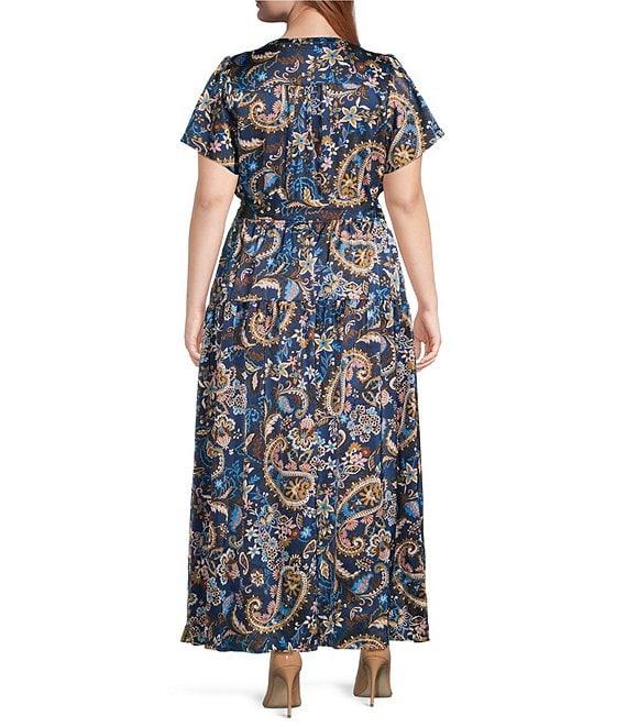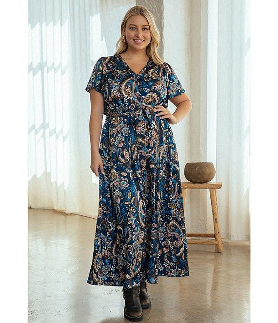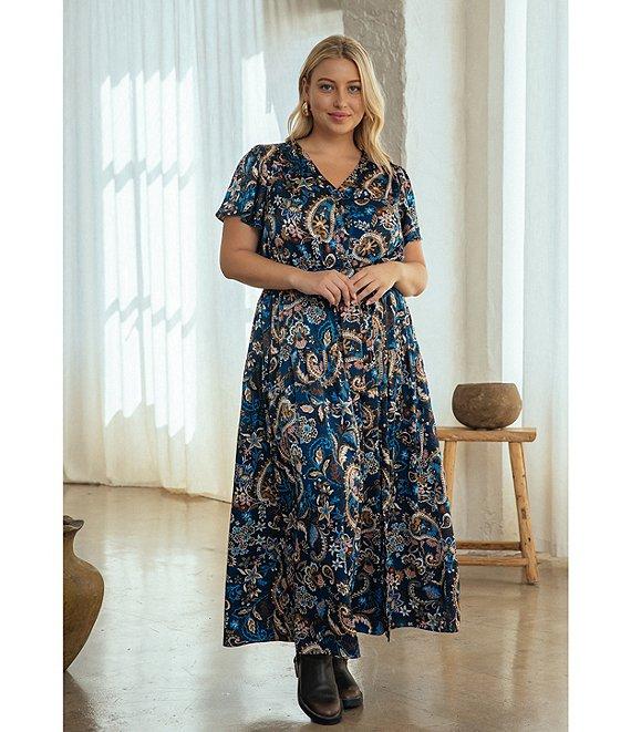 Skies Are Blue Plus Size Paisley Printed Short Sleeve Long Dress