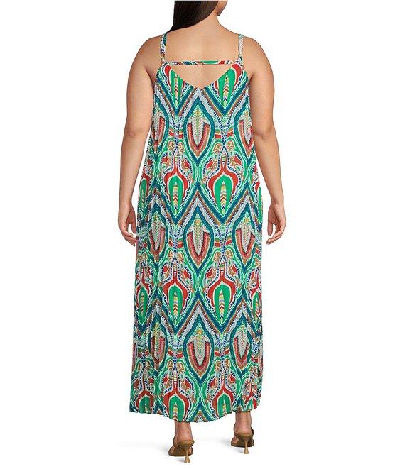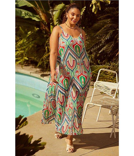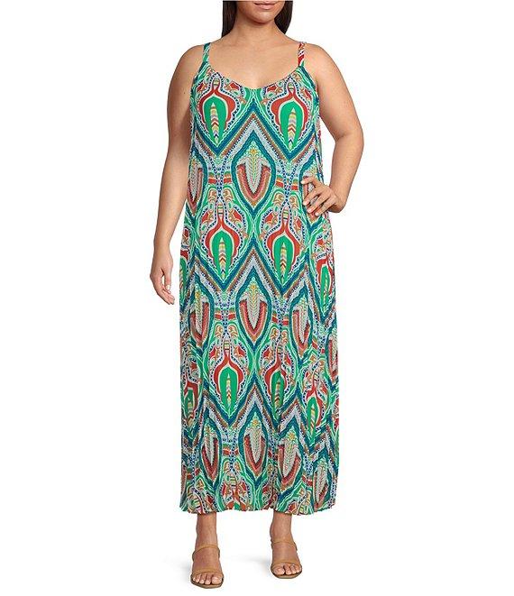 From Skies Are Blue Plus Size, this dress features: Allover print v-neckline Sleeveless Pleated silhouette Pullover styling Polyester Hand wash/line dry Imported.
