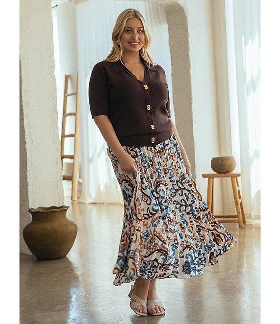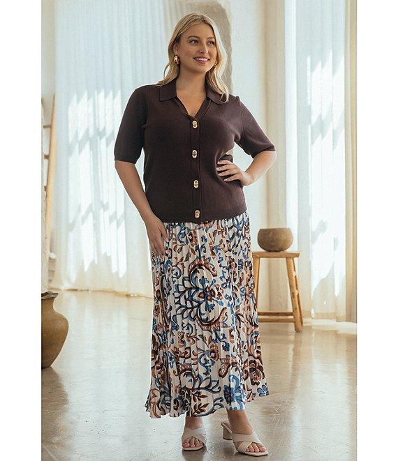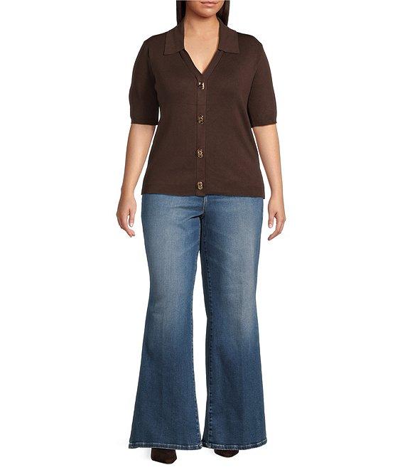 From Skies Are Blue Plus, this cardigan features: Collared v-neckline Short sleeves Button front closure Gold tone twist-and-lock buttons Viscose/nylon knit Hand wash/line dry Imported.