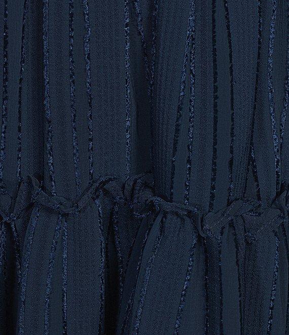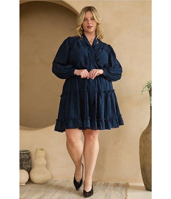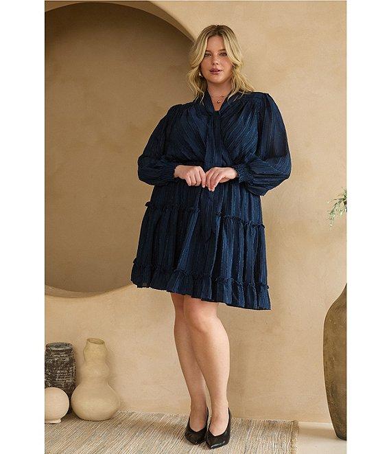 From Skies Are Blue Plus, this dress features: Textured chiffon fabrication V-neckline Tie-neck detail Long blouson sleeves Smocked waist detail Pullover construction Tiered ruffle hemline Lined Mini length Approx. 40" length Polyester Hand wash Imported.