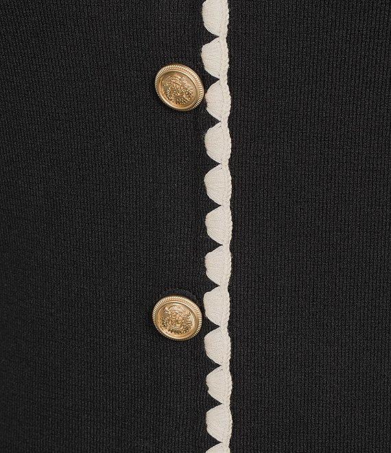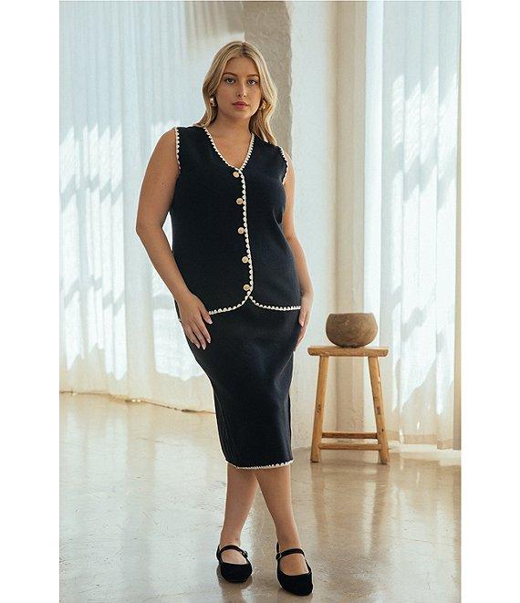 From Skies Are Blue Plus, this vest features: Sweater knit fabric V-neckline Sleeveless Button front closure with gold tone buttons Contrast whip stitched scalloped edging Blends femininity with structured sophistication Approx. 27.25" high point shoulder length Viscose/polyester/nylon sweater knit Hand wash/line dry Imported.