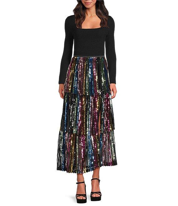 Skies Are Blue Sequin Rainbow Striped Tiered Maxi Skirt
