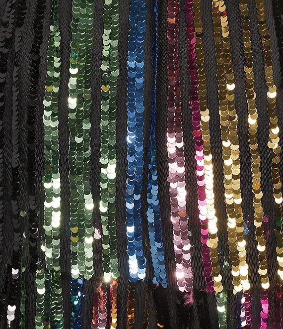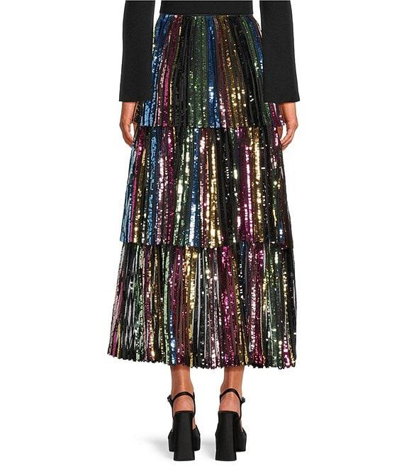 From Skies Are Blue, this skirt features: Multi-colored sequin fabrication Tiered hemline Side zip closure Approx. 38" length Self: polyester/spandex: lining: polyester/spandex Hand wash cold/hang to dry Imported.