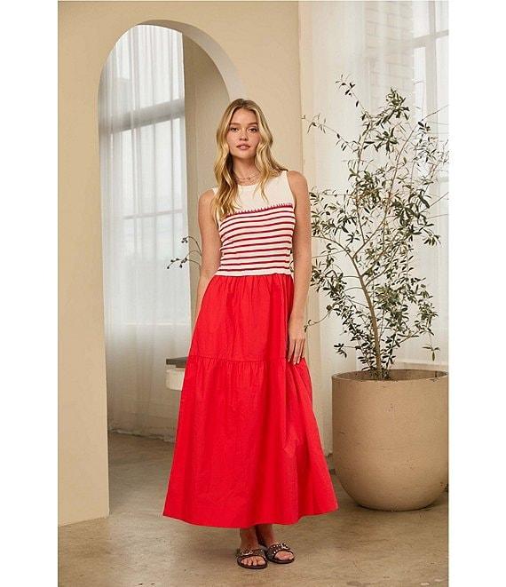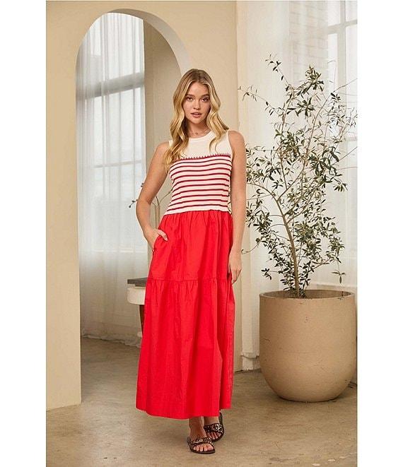 From Skies Are Blue, this dress features: Knit top fabrication Stripe print Poplin skirt fabrication Crew neckline Picot stitch detail Sleeveless Pullover construction A-line silhouette Tiered skirt Side seam pockets Approx. 52.5" length Self: viscose/polyester Contrast: cotton Hand wash Imported.