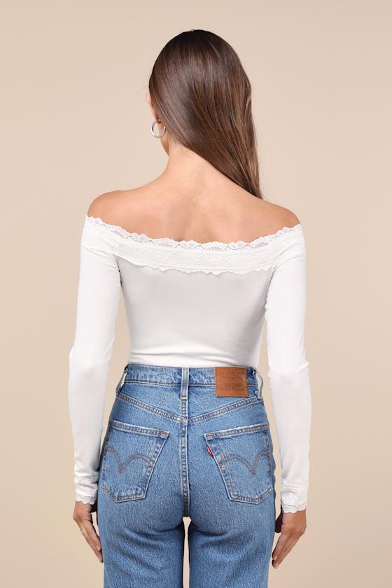 Simply elevated date night looks will definitely include the Lulus Skilled Poise White Ribbed Off-the-Shoulder Lace Bodysuit! Stretchy ribbed knit shapes this flirty lil' bodysuit that features an off-the-shoulder neckline accented with romantic floral lace trim and long sleeves with matching lace-trimmed cuffs. The fitted silhouette continues down to attached thong bottoms that secure with snap closures.