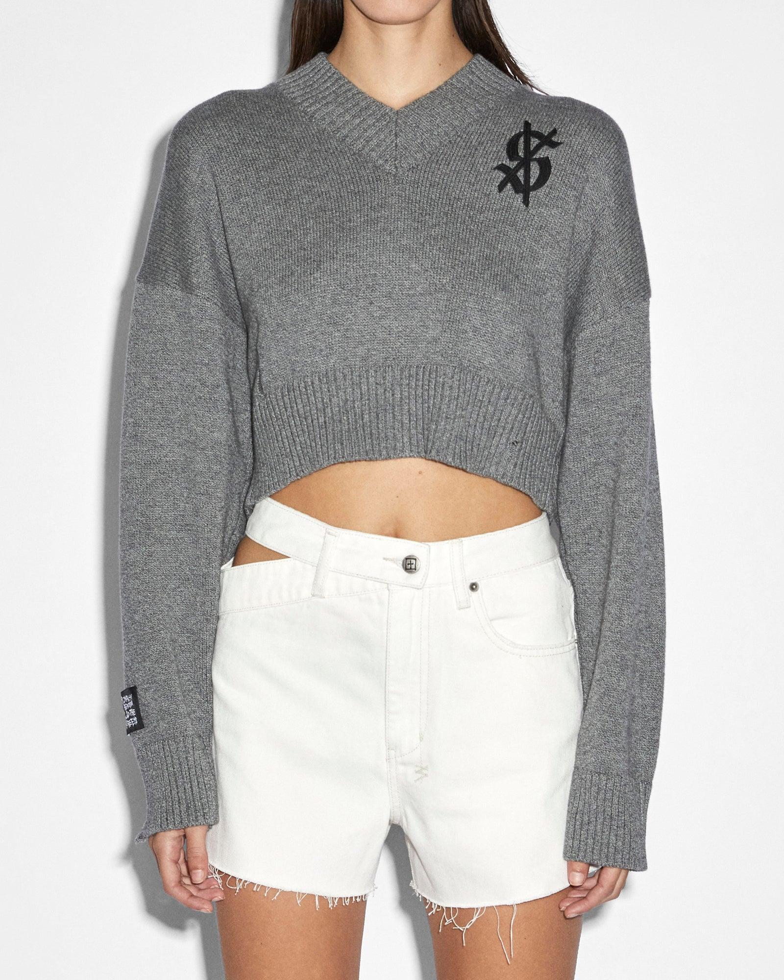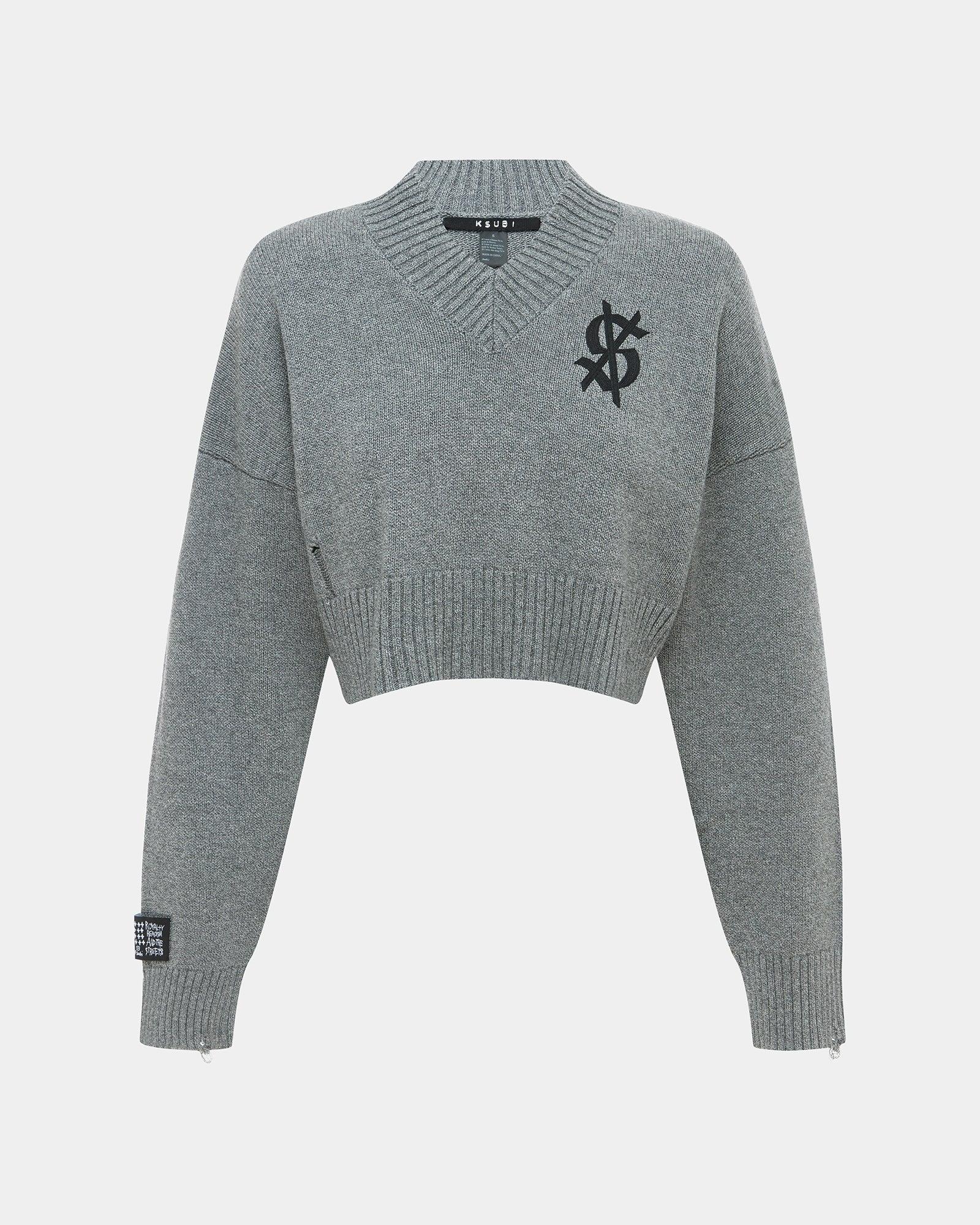 The Skipper Knit Grey Marle is a boxy cropped V-neck sweater with a Ksubi cross dollar logo embroidery on the front. This sweat has intentional deconstruction and laddering for a worn-in look. Made from 100% cotton, this classic grey jumper has a ribbed V-neckline, cuffs and hem band.