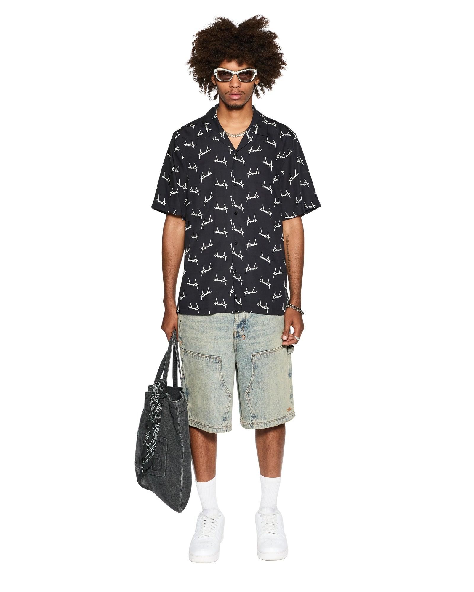 The Skript Resort Short Sleeve Shirt Black is a relaxed fit short sleeve resort shirt with a step hem, crafted from premium tencel. It features a seasonal Ksubi yardage print, premium branded buttons, and signature Ksubi t-box printed branding.