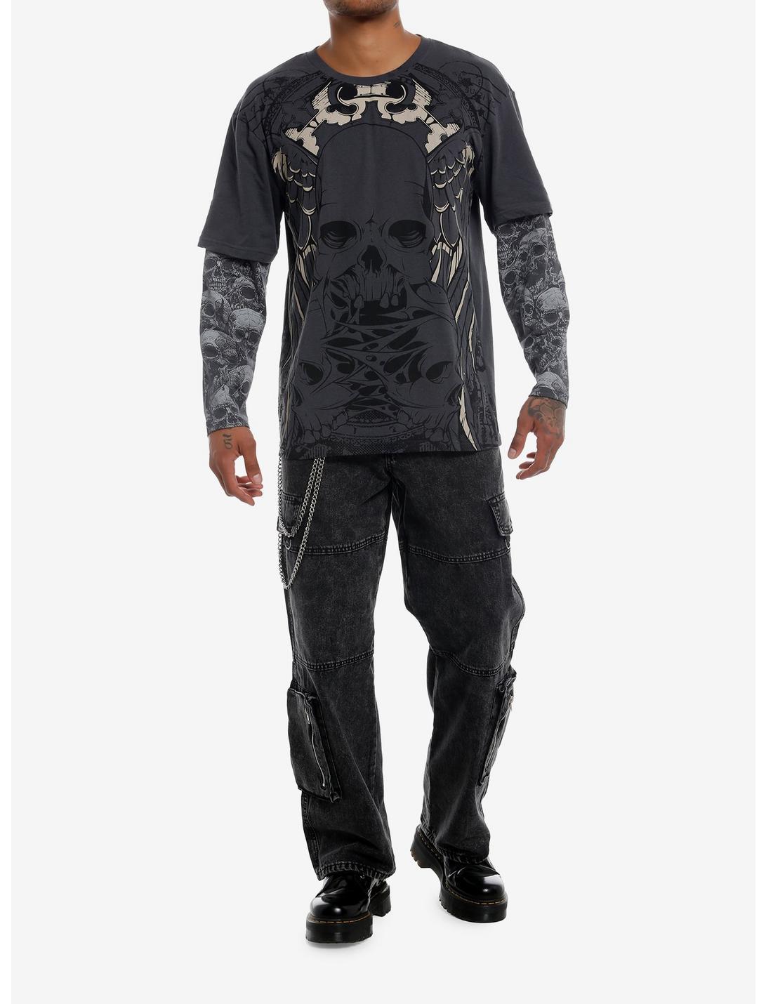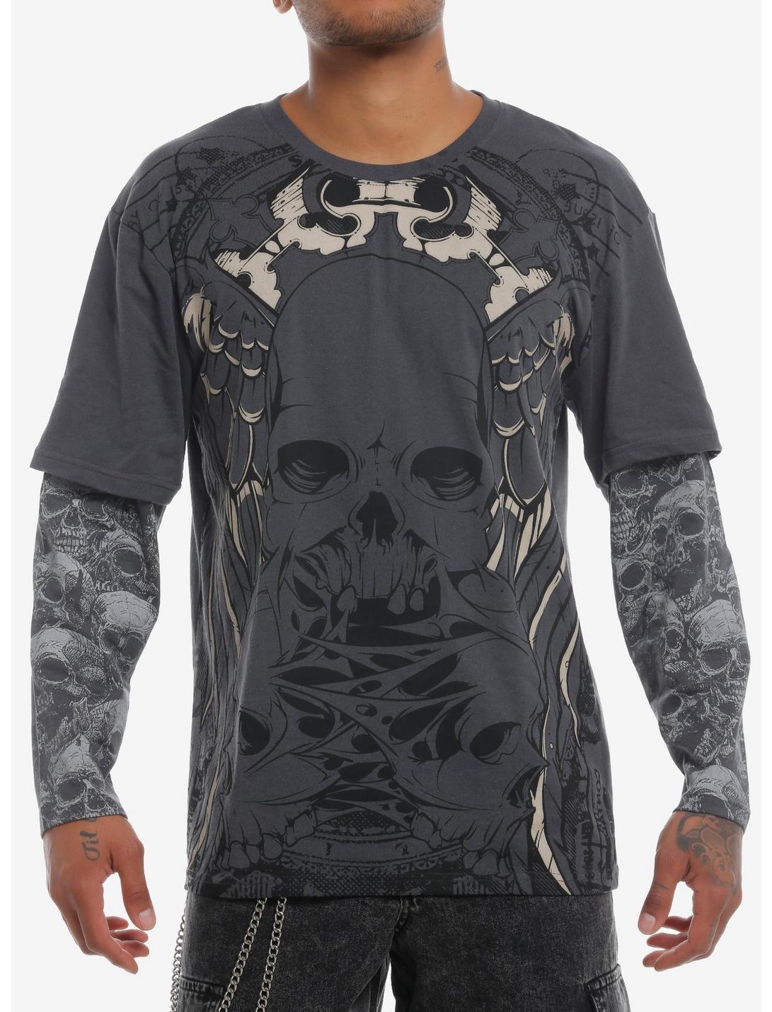 This grey twofer long-sleeve tee is ALL about skulls. The sleeves have a haunting allover print of skulls, and the front of the tee has three skulls ripping apart, surrounded by wings and filigree shapes.60% cotton; 40% polyesterWash cold; dry lowImportedListed in men's/unisex sizesModel is 6'1"Model wears size Medium