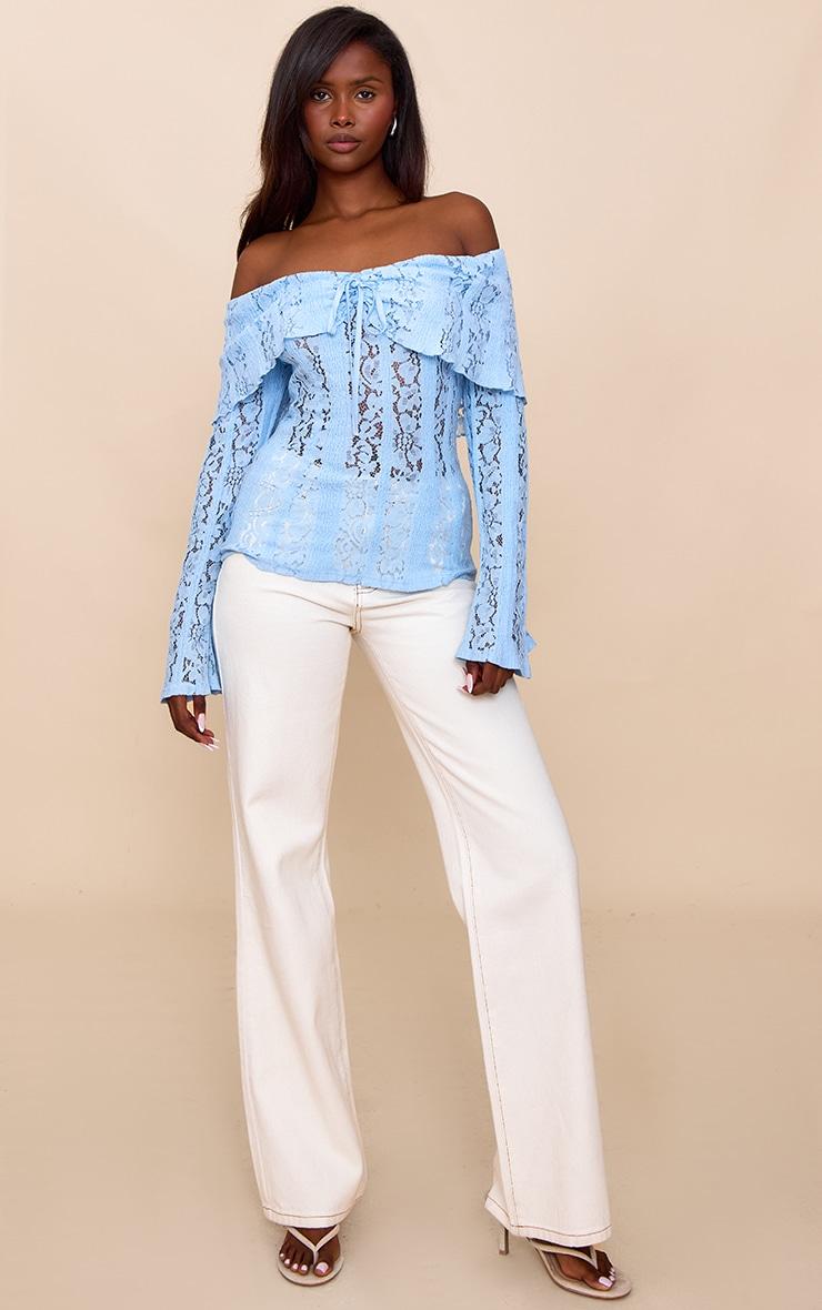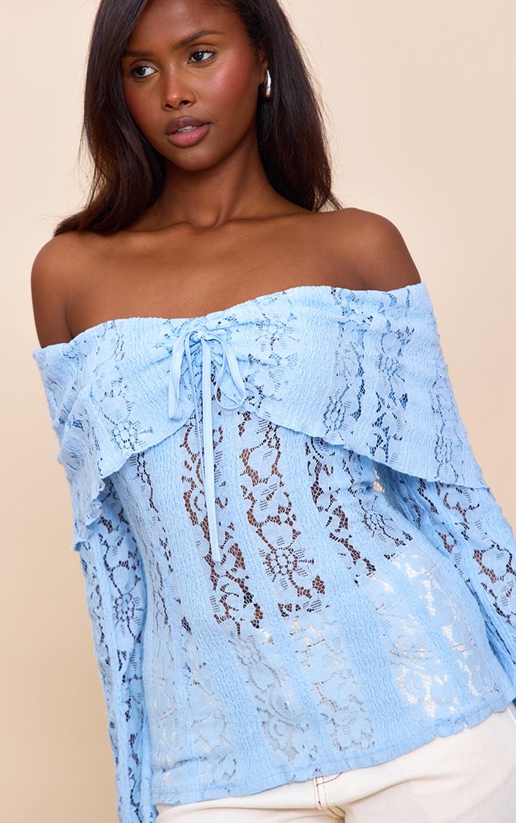 Stand out from the crowd in this sky blue fitted lace flared sleeve bardot top. Woven with care from blue lace, this top has a tie detail at the bust, long sleeves and a bardot neckline. Team it with white pants, stiletto heels and delicate earrings for a day-to-night look.Length approx 48.5cm/19inch (Based on sample size US 4)Model wears size UK 8/ EU 36/ AUS 8/ US 4Model Height - 5ft 9inchp]:!mb-4inch>Brand: PrettyLittleThingCategory: TopsProduct type: Bardot TopColor: Sky BlueMaterial: Woven LaceDesign: PlainNeckline: BardotSleeves: LongOccasion: Evening