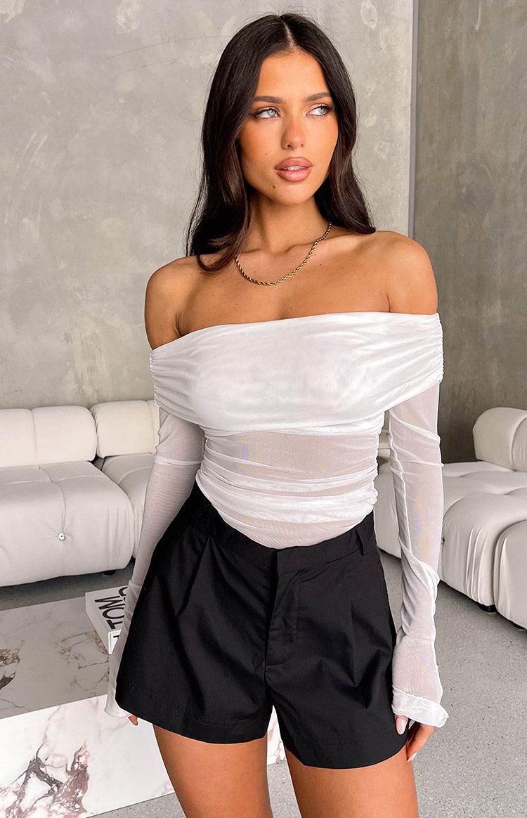 White Mesh Off The Shoulder Top How to style: Our sleek and stylish off the shoulder top is everything you've been looking for. Pair this stunning number with a mini skirt and stiletto heels for the perfect party look! Features: Sheer mesh fabrication Light-weight material Lined at bust Overlapped detailing at bust Long sleeve style Flared sleeve hem Lots of stretch Off the shoulder style