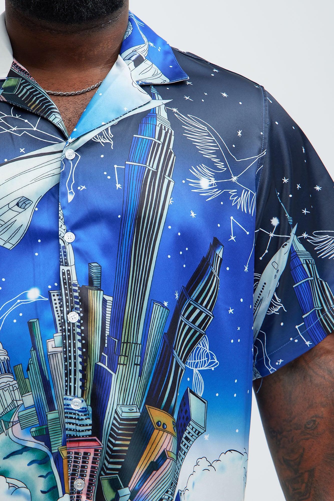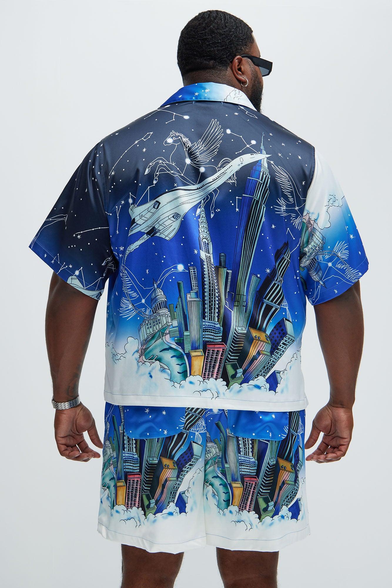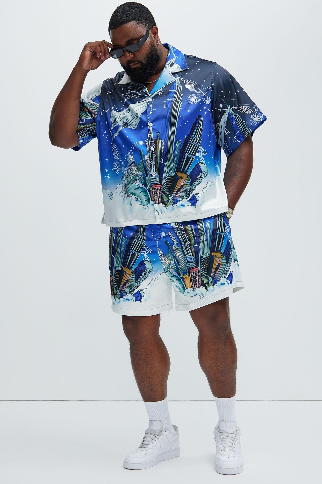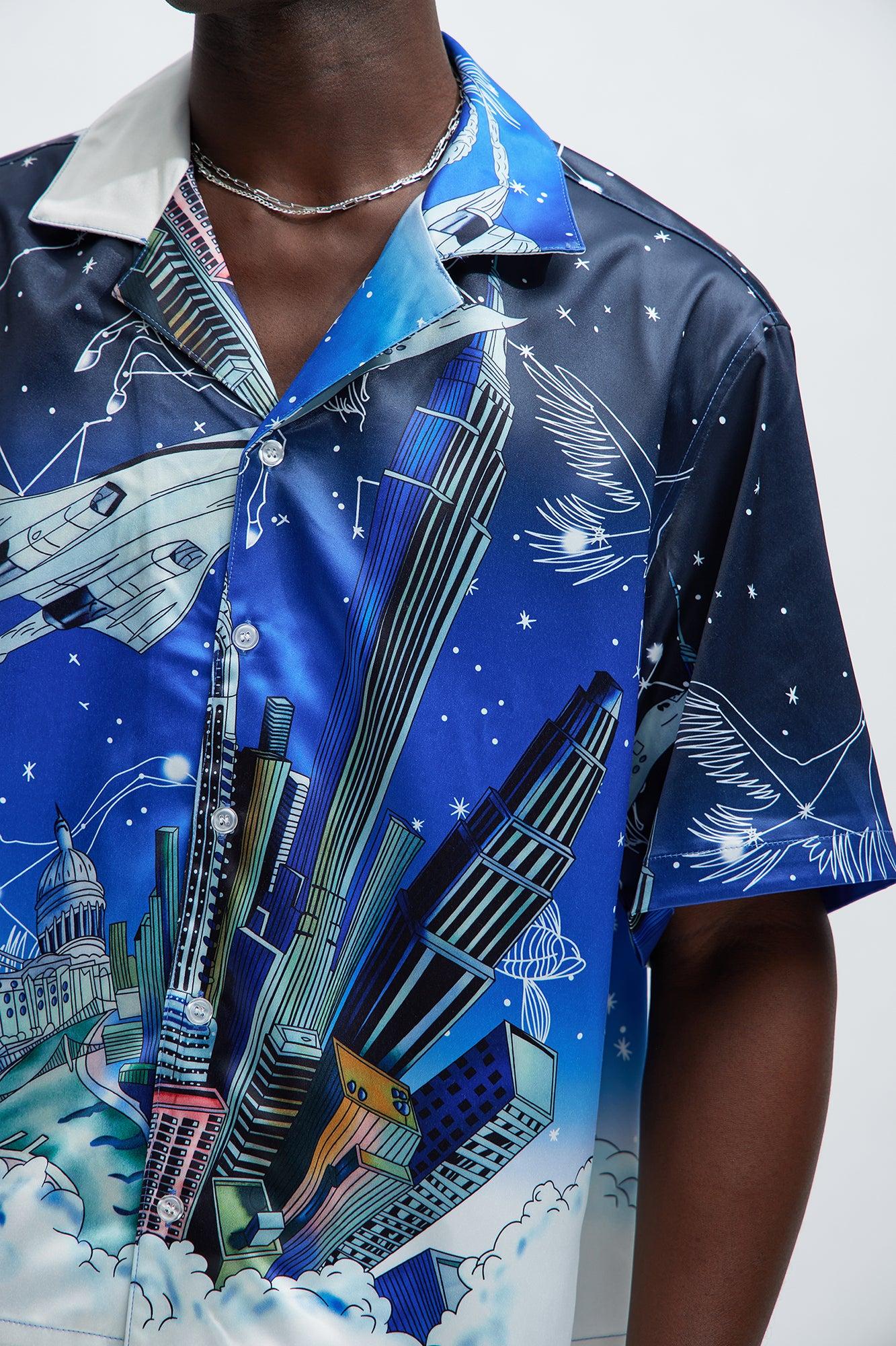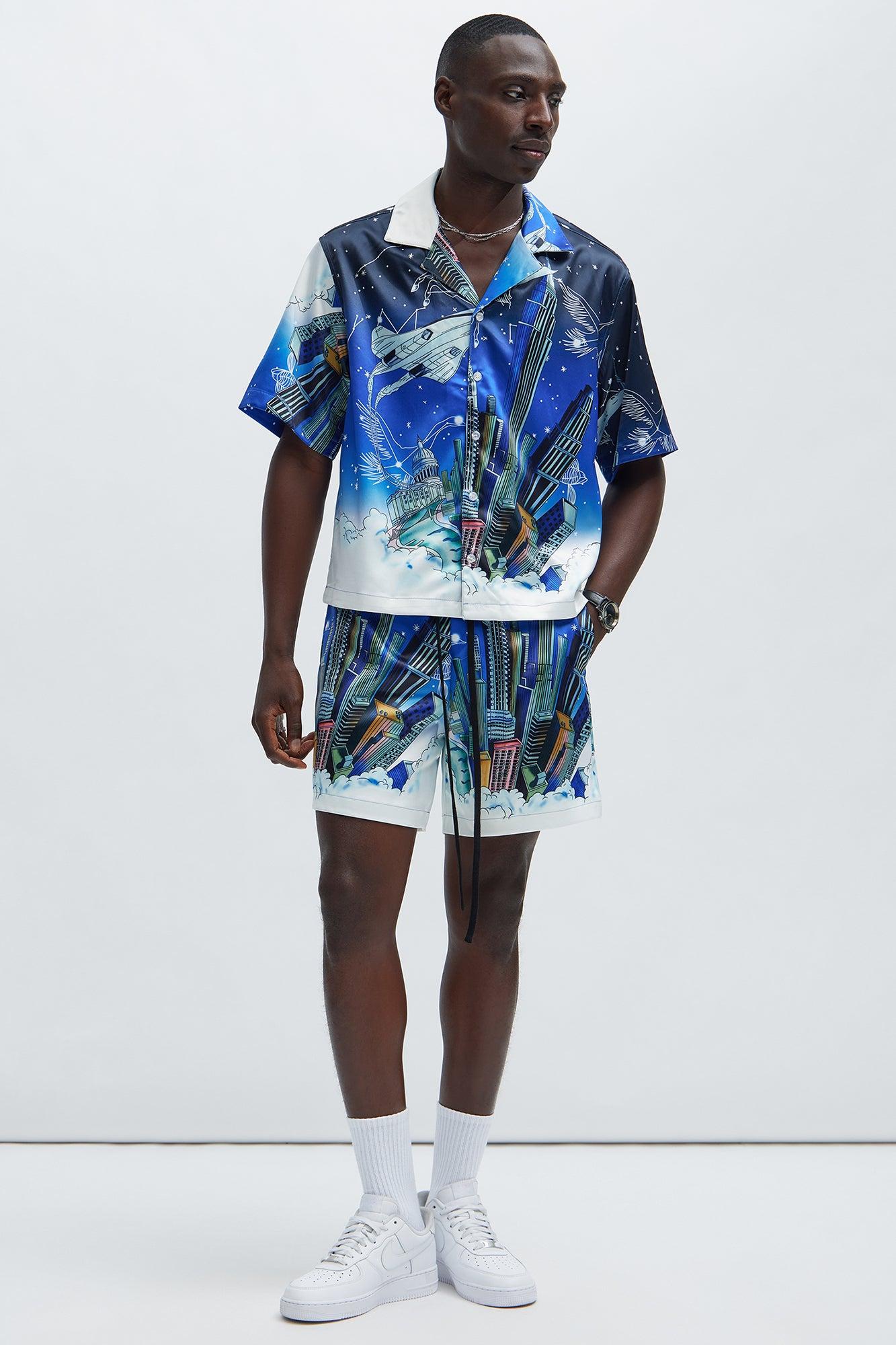 Available In Blue/combo. Fold Down Collar Front Button Closure Short Sleeve Bottom Side Slit Pair With Skyline Printed Shorts Disclaimer: Print Placement May Vary. Shell: 98% Polyester 2% Spandex Imported California Proposition 65 WARNING: Cancer and Reproductive Harm - www.P65Warnings.ca.gov.