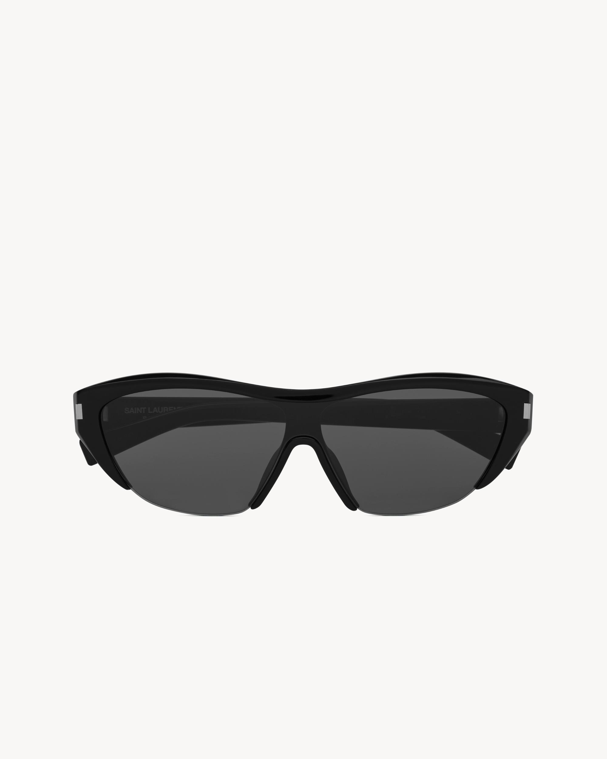 half-rim shield sunglasses with acetate frames and nylon lenses.