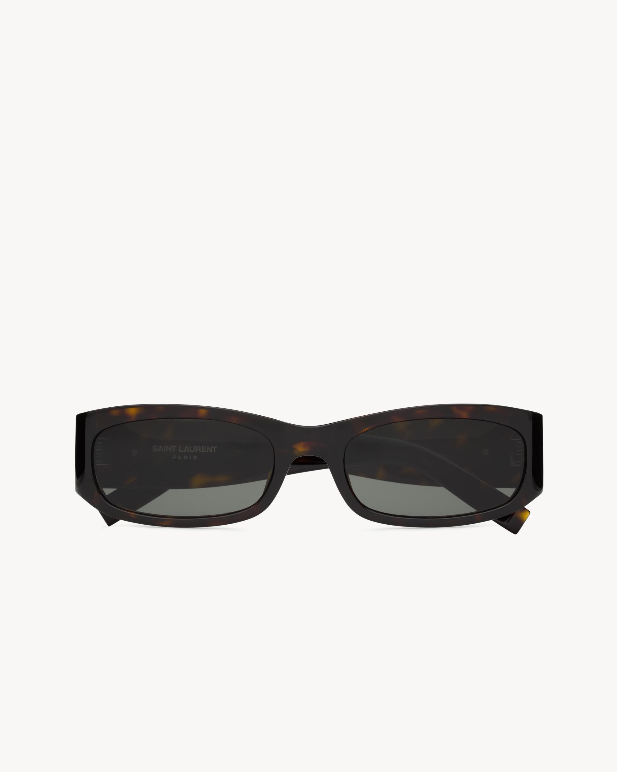RECTANGULAR TORTOISESHELL SUNGLASSES WITH ELONGATED ACETATE FRAMES AND NYLON LENSES, FEATURING WIDE TEMPLES.