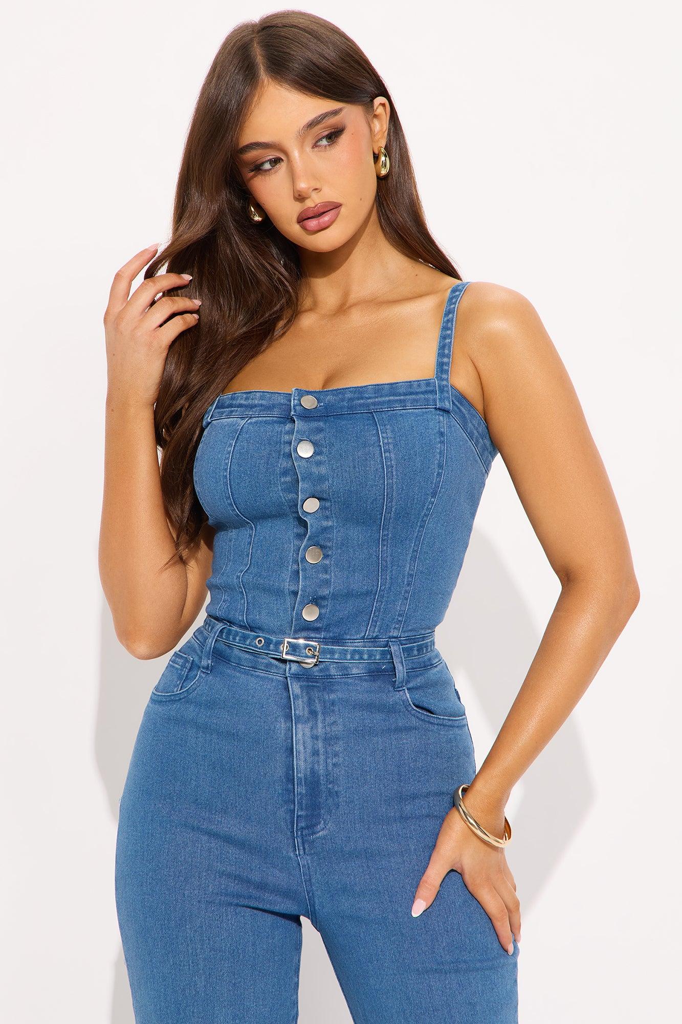 Available In Dark Denim And Medium Wash. Jumpsuit Stretch Adjustable Straps Button Up Belted Wide Leg 32" Inseam Disclaimer: Due To The Specialized Wash Process, Each Garment Is Unique. Self: 76% Cotton 22% Polyester 2% Spandex Lining: 80% Polyester 20% Cotton Imported