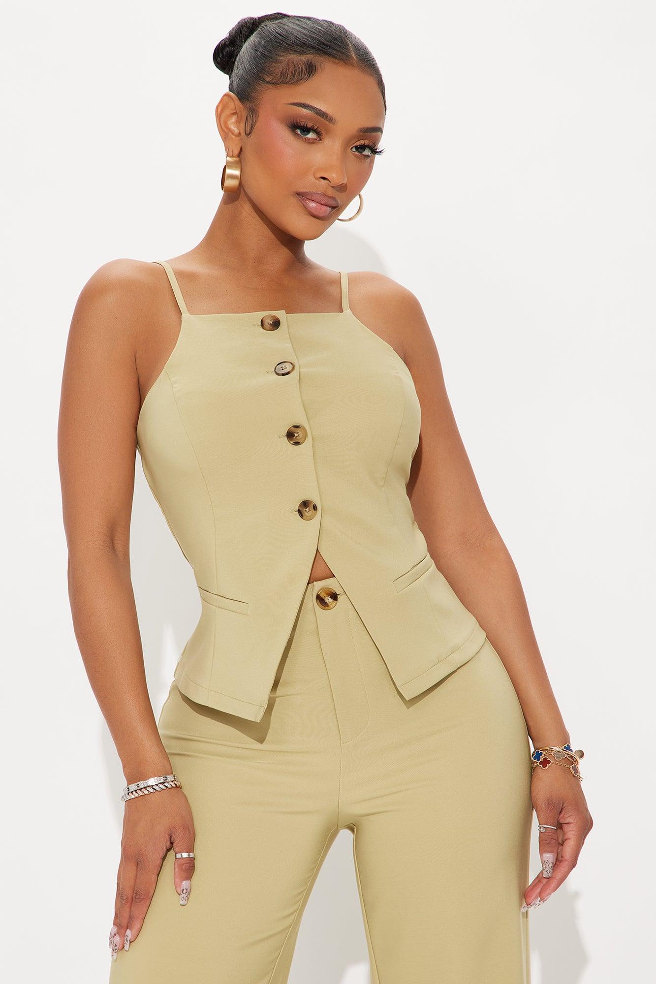 Available In Khaki And Olive. Vest And Wide Leg Pant Set Stretch Inseam 31.5" Adjustable Straps Button Up 97% Polyester 3% Spandex Imported