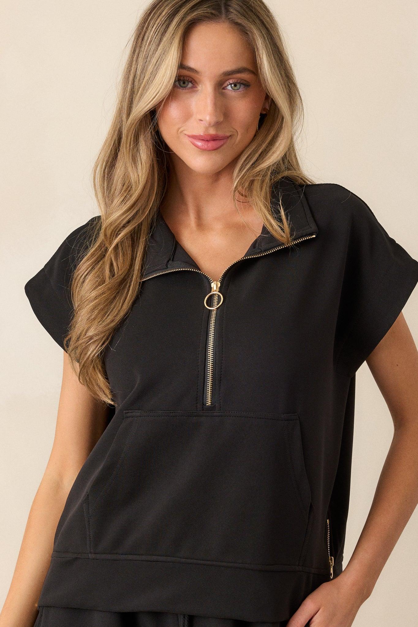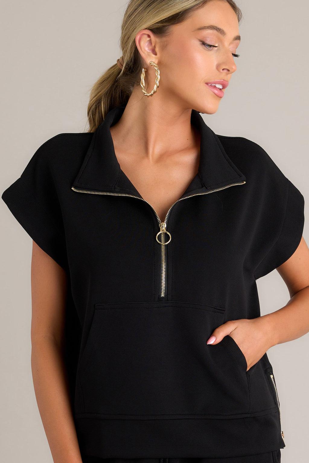 Conquer the streets with our Sleek Street Black Pullover. This short sleeve half-zip isn't just stylish, it's functional. Keep cool while looking cool with its lightweight design and stay ahead of the competition with its convenient front zipper. Take on any challenge with confidence and style! This black pullover features a collared neckline, gold hardware, a functional half zip design, a kangaroo pocket, functional zippers on the sides, and short cap sleeves.