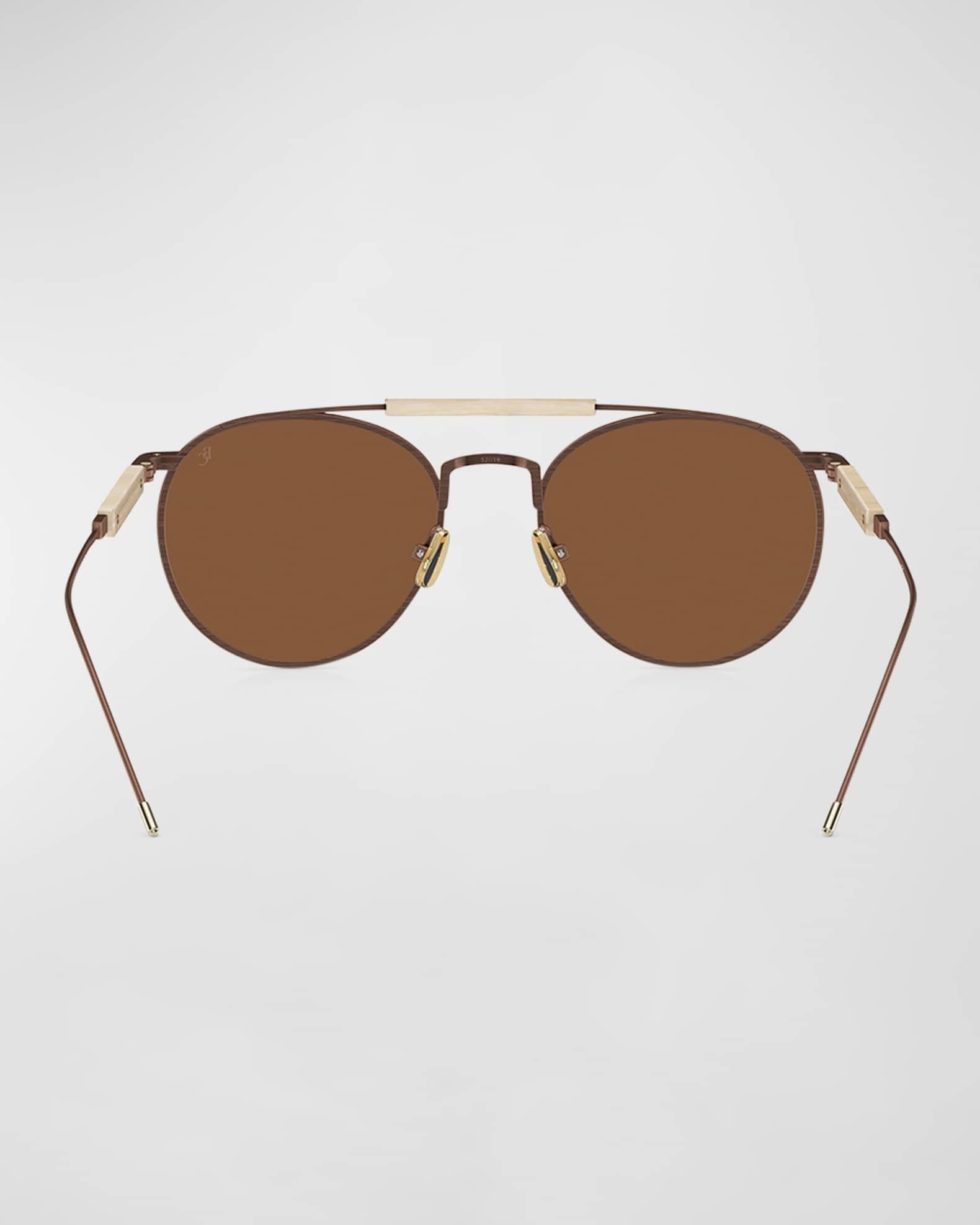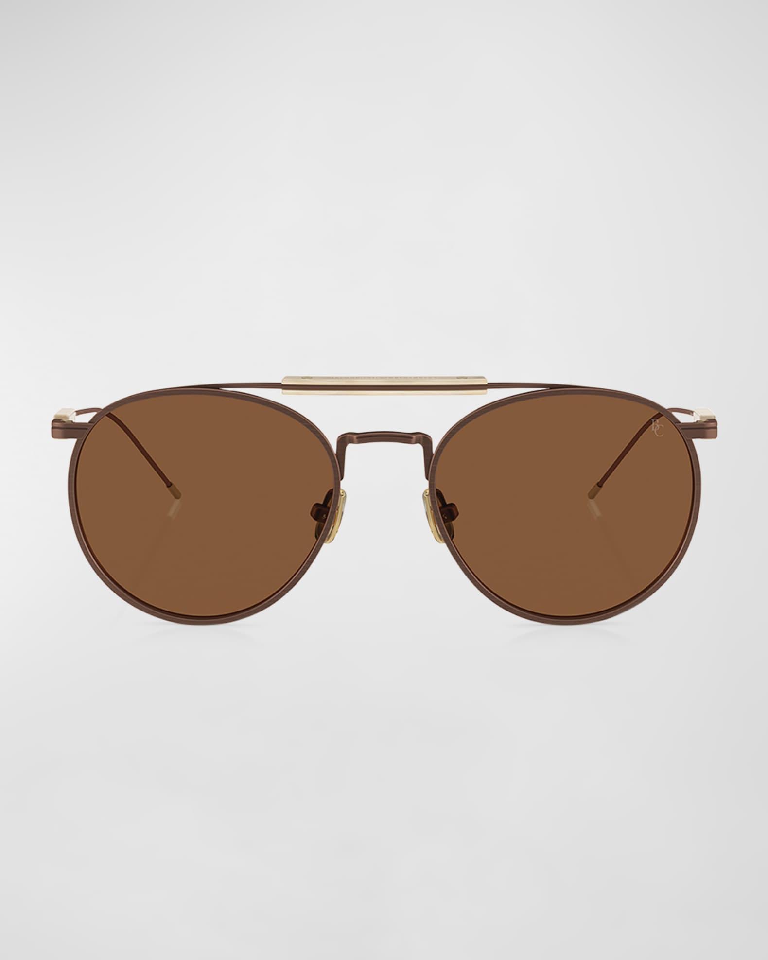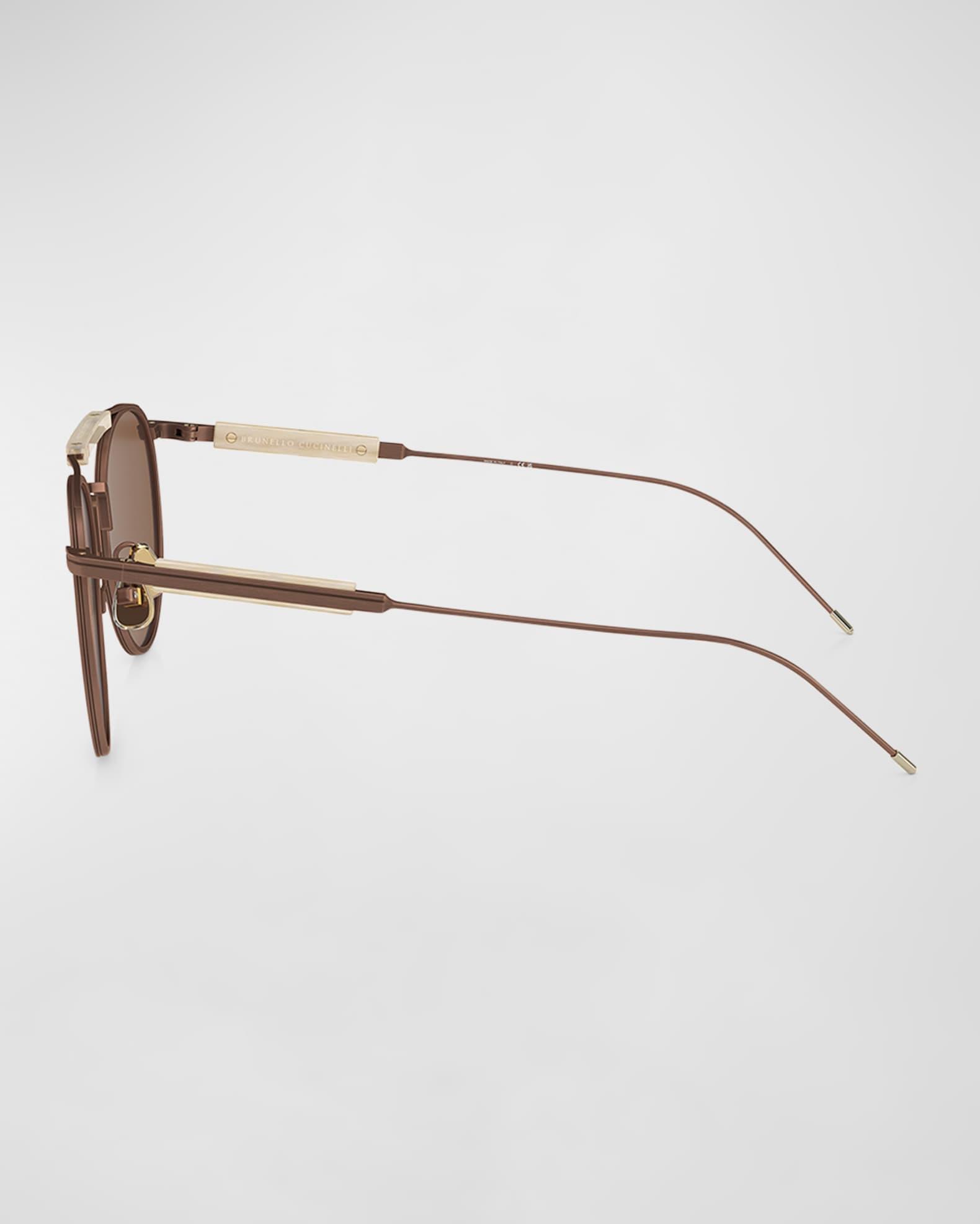 Brunello Cucinelli "0BC 2004ST" round aviator sunglasses in titanium and metal crystal Part of the Multimaterico Story Collection, where premium materials form elevated and original concepts. Lens/bridge/temple (in mm): 52-19-145 Distinctive brow bar Polarized lenses; logo on corner Adjustable nose pads Thin, tapered arms Style is RX-able 100% UVA/UVB protection Made in Brazil Proposition 65 warning for California residents