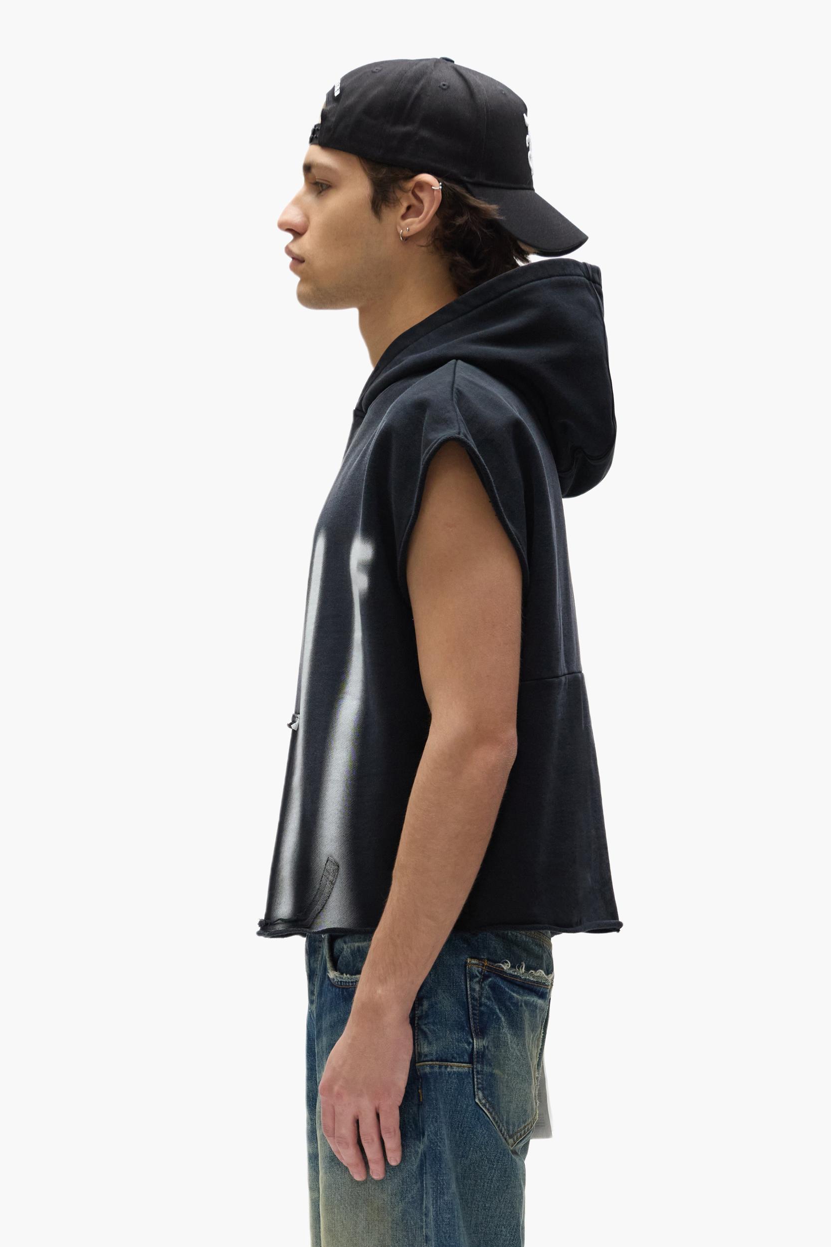 This sleeveless hoodie is made from midweight cotton fleece with Purple brand lettering at the chest and down the front. It’s designed for an oversized fit with drop shoulders, and a kangaroo pocket. Pre Fall 2025 White Label 100% Cotton Oversized Fit Midweight Fleece Digital Print