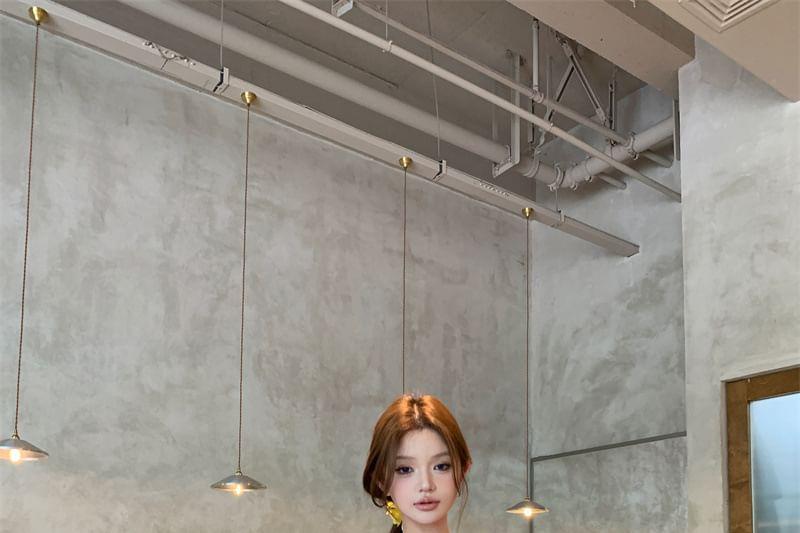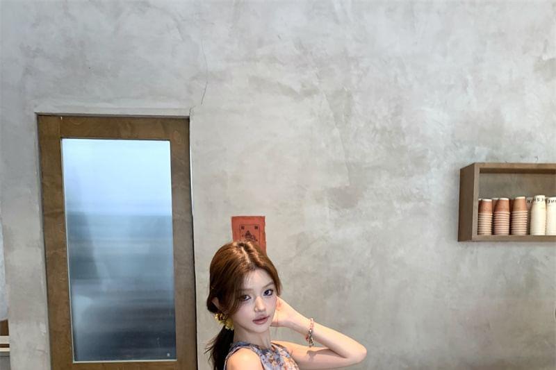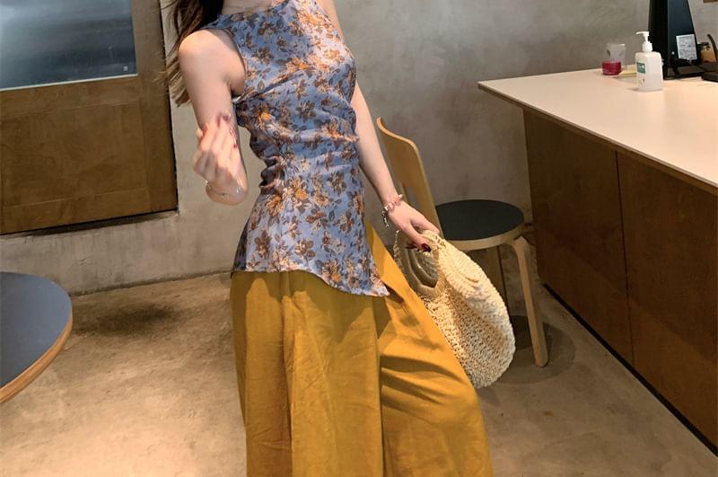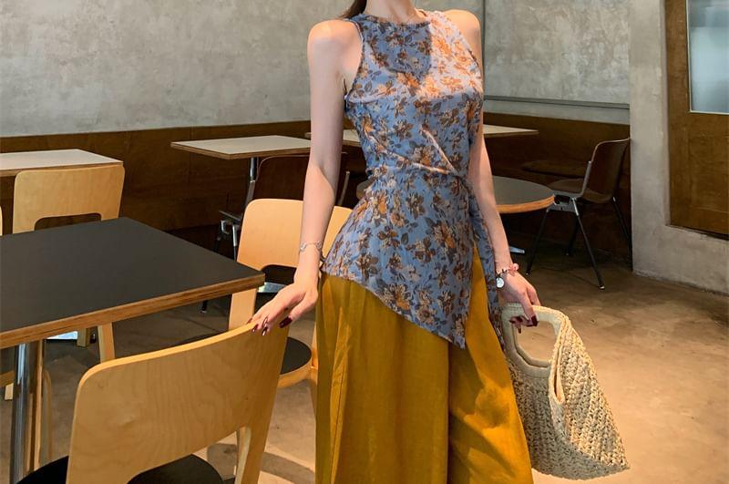 Sleeveless Round Neck Floral Print Top / High Rise Wide Leg Pants