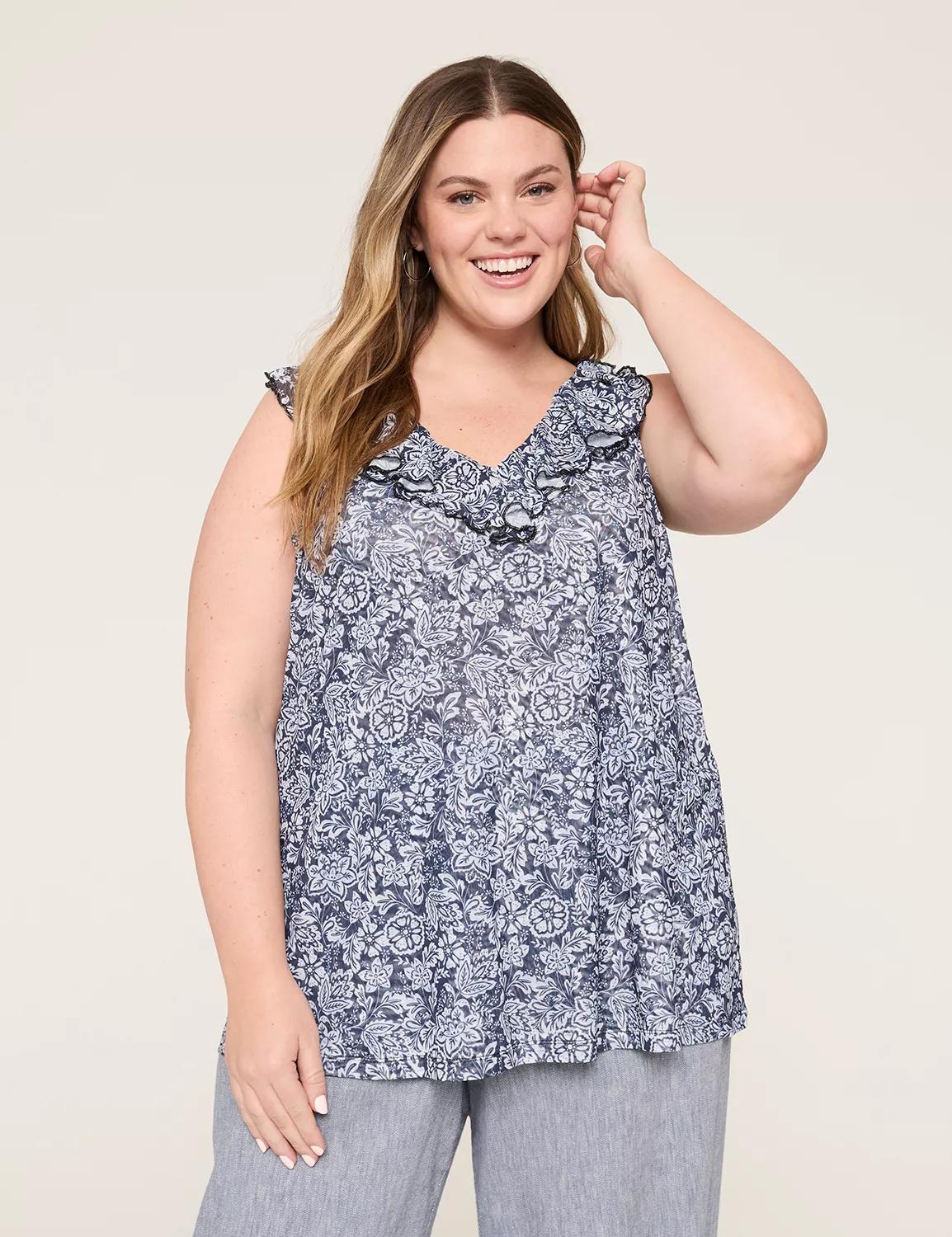 Available in Plus Size A top all about simplicity and versatility, in sun-soaked prints. Youll love the simple-yet-statement ruffle neckline and soft, lined mesh. Pair with everything from low-key shorts to a party-ready skirt. FIT: Classic. Designed for curves and a not-too-tight, not-too-loose, just-right fit. Front Body Length From Shoulder: 31 (On Size 18) Longer length is perfect for added coverage FEATURES: V-neck with ruffle Sleeveless FABRIC: Soft, stretchy double-layer mesh Machine Wa
