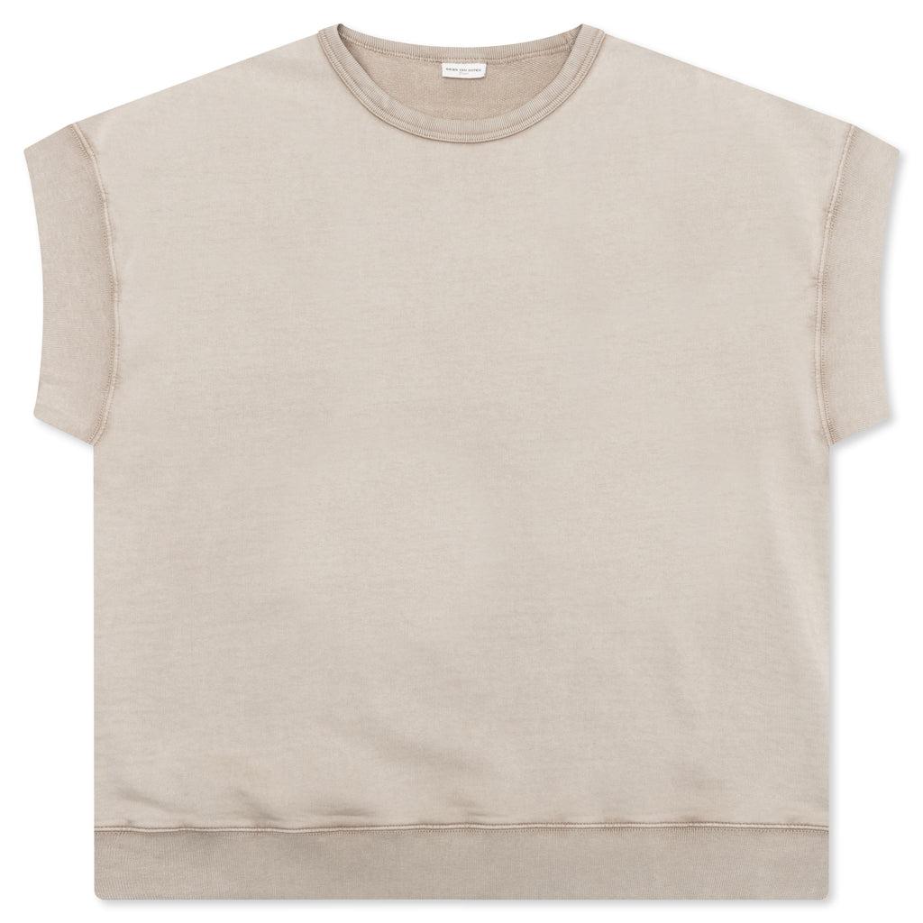 Dries Van Noten's Sleeveless Sweater in beige features ribbed cuff sleeves made from 100% cotton materials, this T-shirt offers a soft and oversized fit, perfect for everyday wear. 100% Cotton Oversized Fit Rolled collar Ribbed sleeves Style No: 241-021157-8611-103