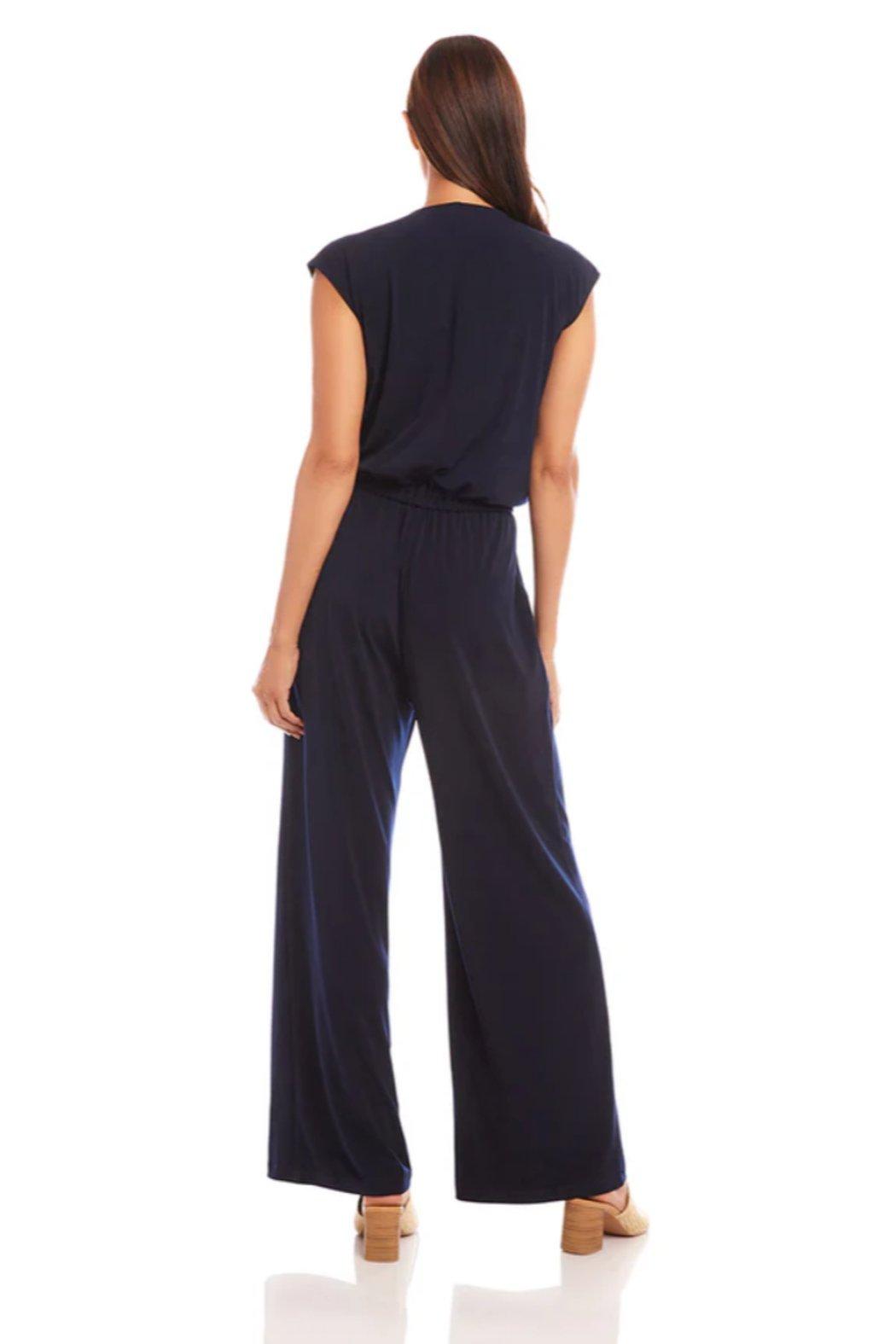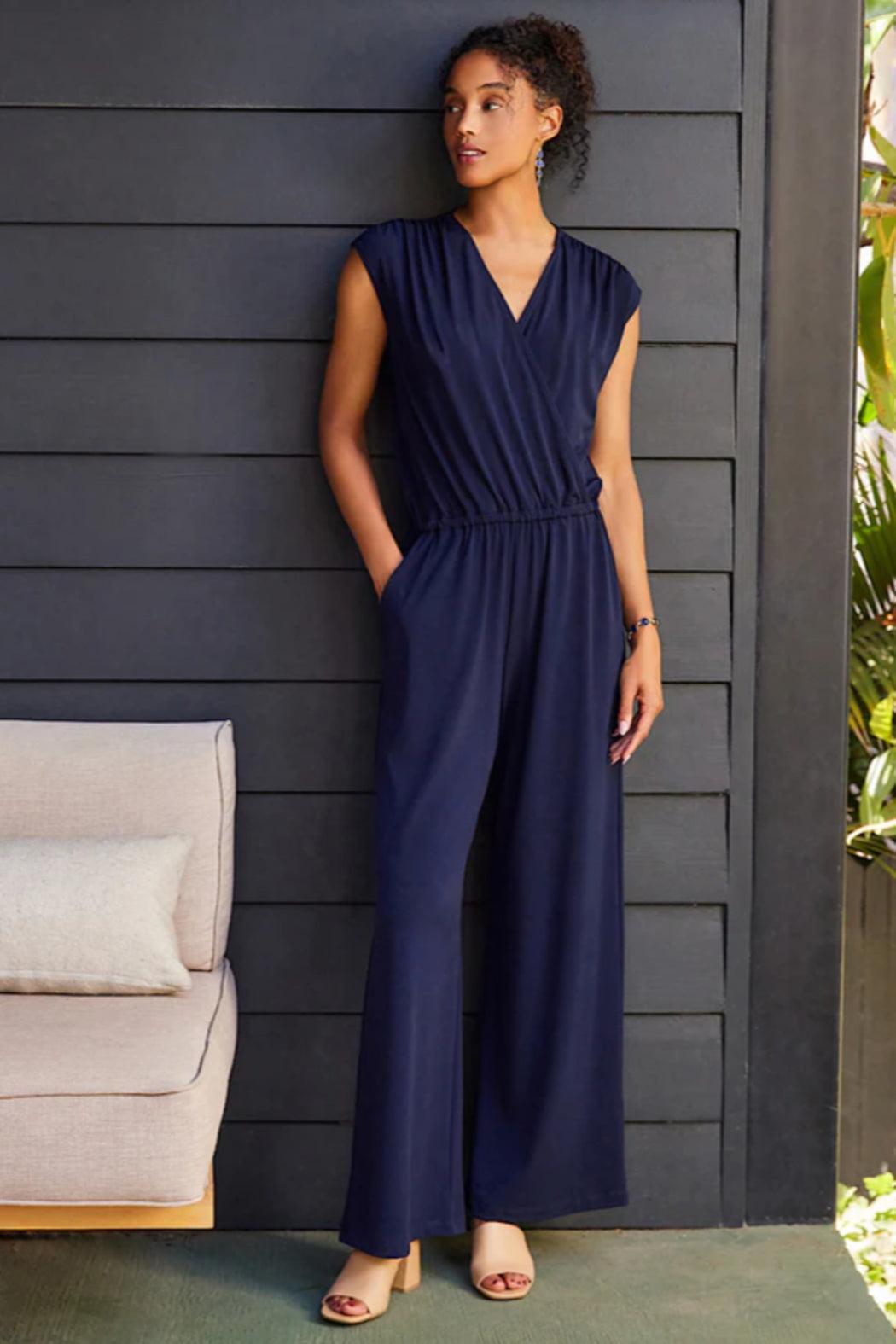 This sleeveless jumpsuit is crafted from a luxurious travel jersey material that is both wrinkle-resistant and stretchy. Featuring an elasticized waistband, this jumpsuit combines comfort and style, making it the perfect choice for any occasion. Stay effortlessly chic and comfortable with the travel-friendly design of this jumpsuit.