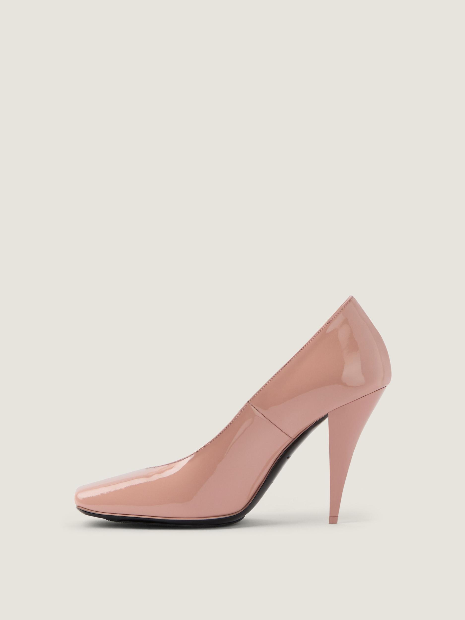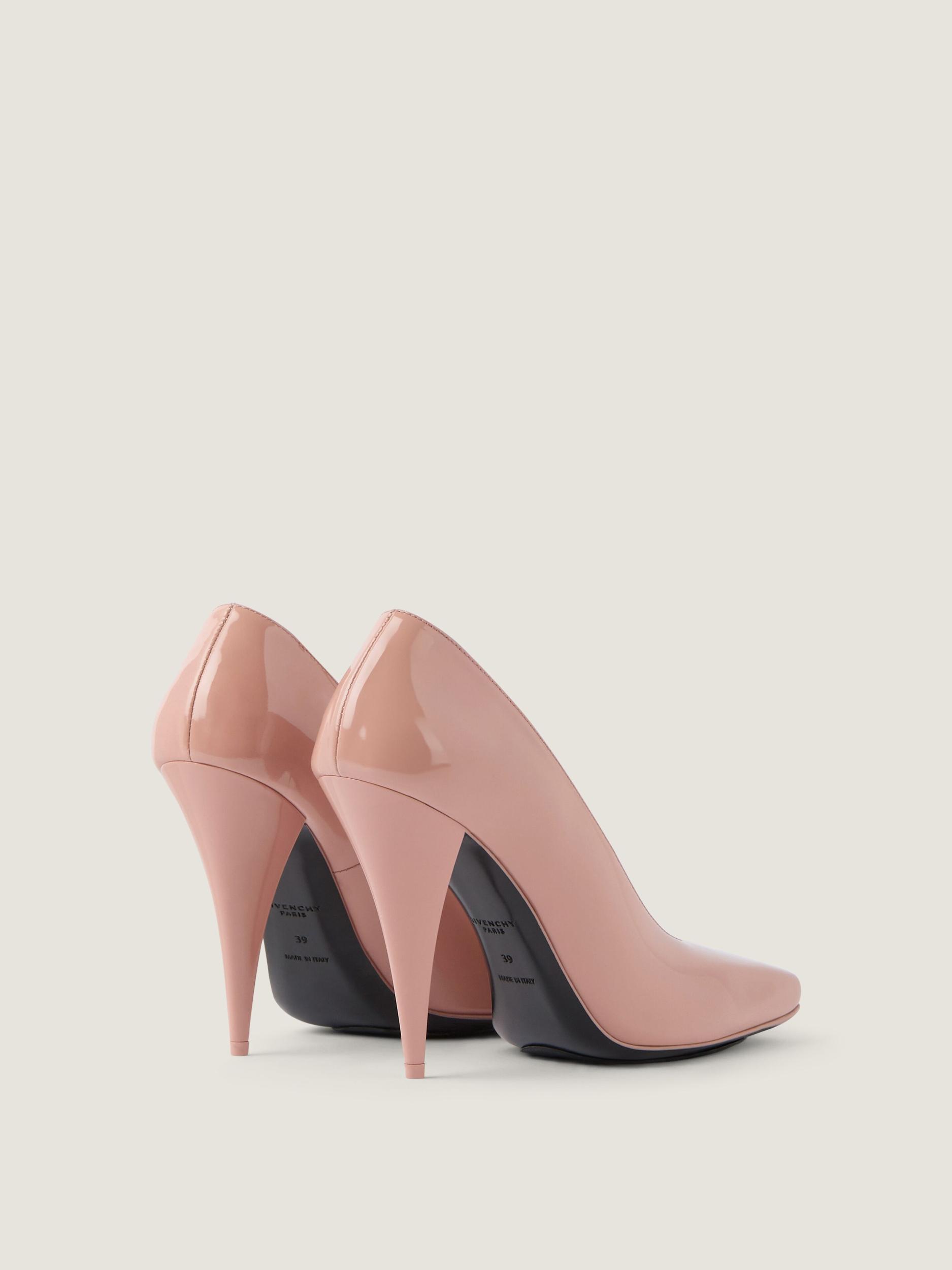 Pumps in patent calfskin leather. Sliced Square line. Low décolleté. GIVENCHY label on the leather insole. Squared toe. Curvaceous cone heel. Heel height: 3.7 in.