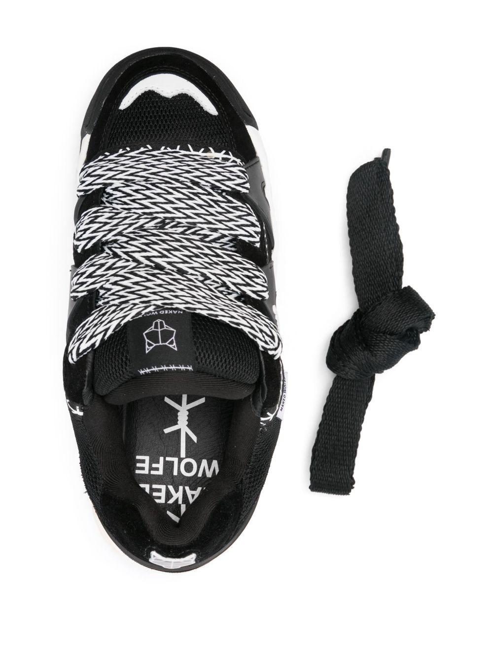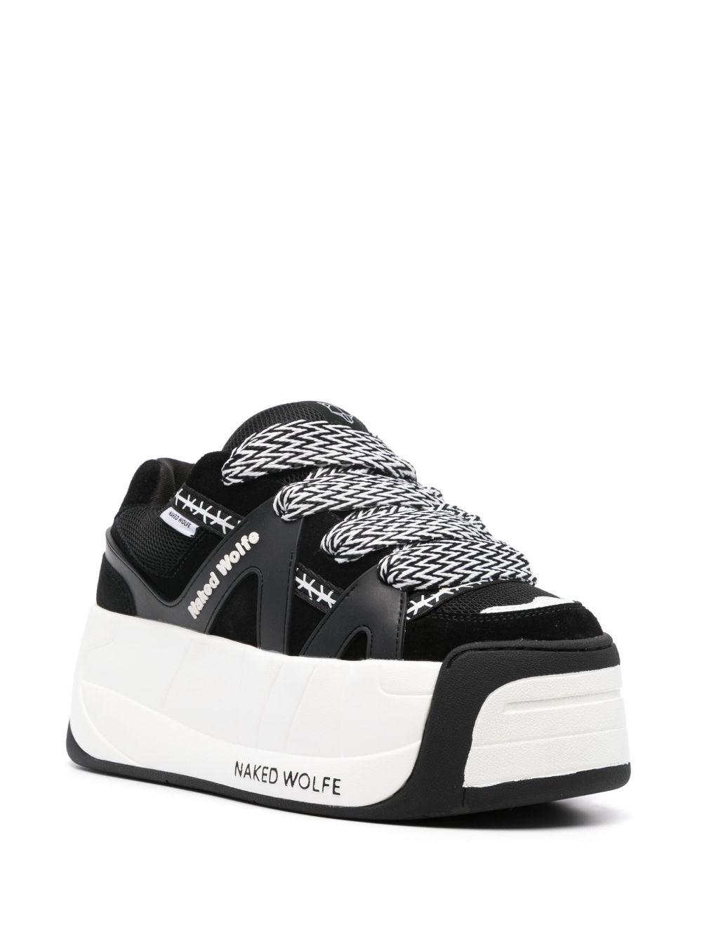 NAKED WOLFE Sliders leather platform sneakers | Black | black/white | calf leather | microsuede | almond toe | contrasting panel detail | mesh detailing | logo patch at the tongue | rubberised logo detail | mini logo tag | branded heel counter | branded insole | platform sole | front lace-up fastening | This piece comes complete with a protective dust bag. | Leather | Low-Tops | Trainers | Shoes | Women