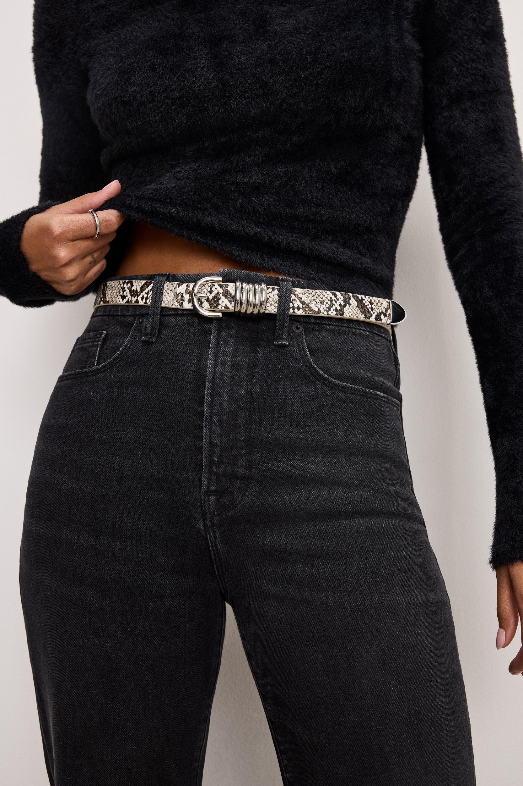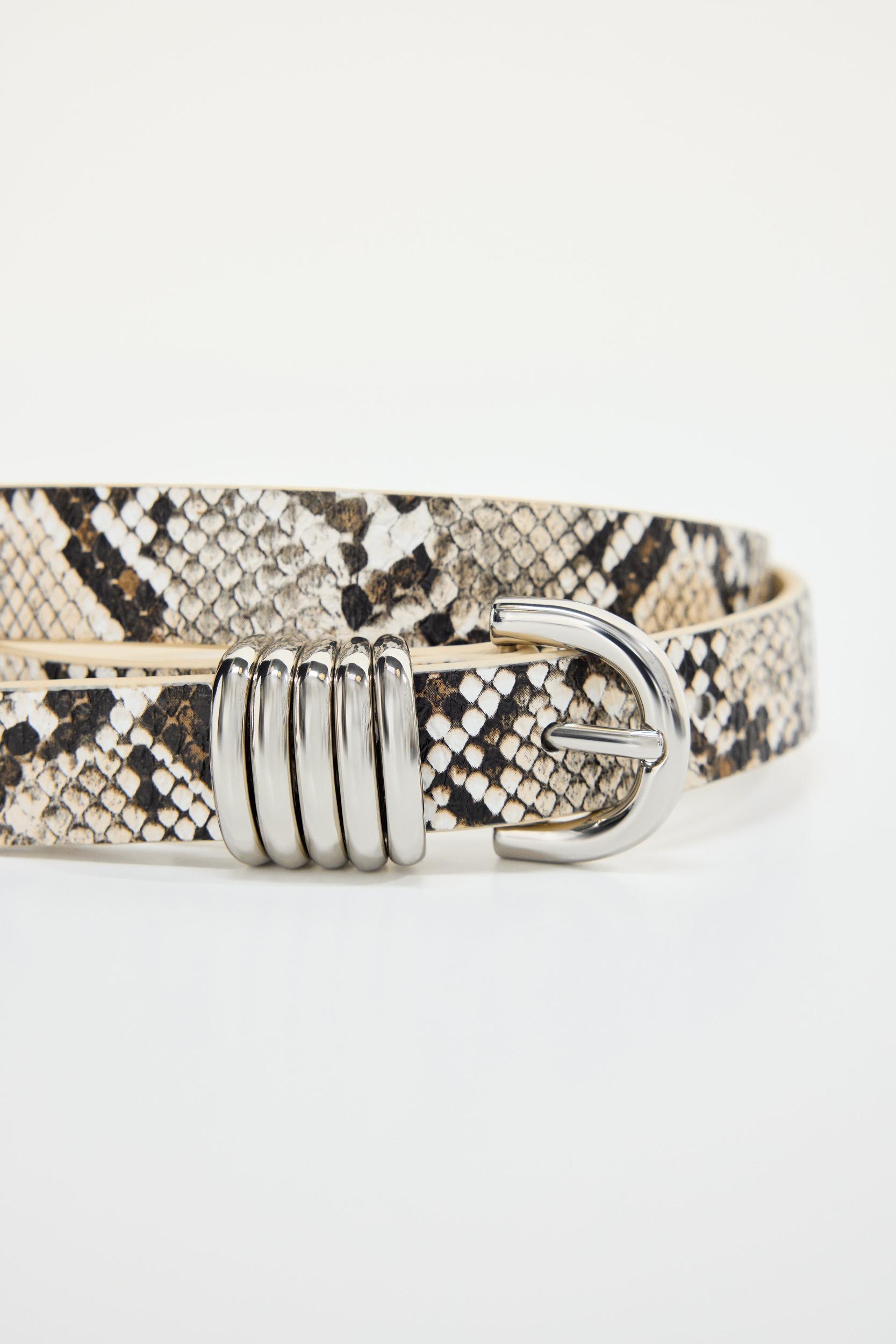 Sleek, sophisticated, and endlessly versatile. The Slim 5-Ring Belt instantly elevates your look with elegant 5-ring hardware that mirrors the allure of fine jewelry. Crafted from premium vegan leather, it features five adjustment holes for a flawless fit. Designed to be at your natural waist—size up if you prefer a more relaxed or low rise wear. Faux leather 7 adjustment holes Snake print Oval buckle Slim strap