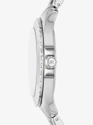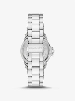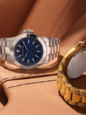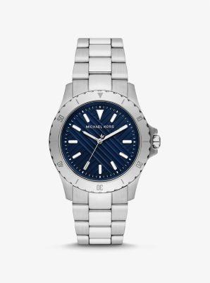 From Michael Kors, the Mens Everest Three-Hand Stainless Steel Bracelet Watch features:Gender: menDial: blueCase Size: approx. 40mmCase Thickness: approx. 9.5mmWater Resistance: 10 ATMMovement: three handBand Material: stainless steelBand Color: silverBand Width: approx. 22mmInner Circumference approx.: 200 /- 5mmClosure: 2 pusher foldover claspImported.