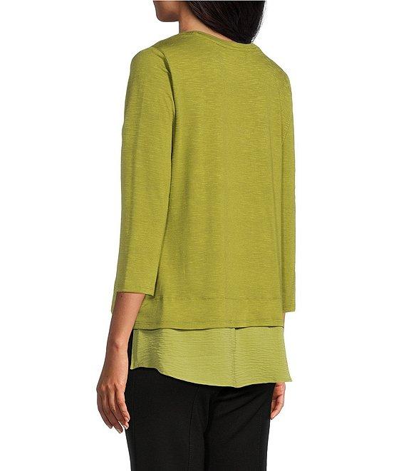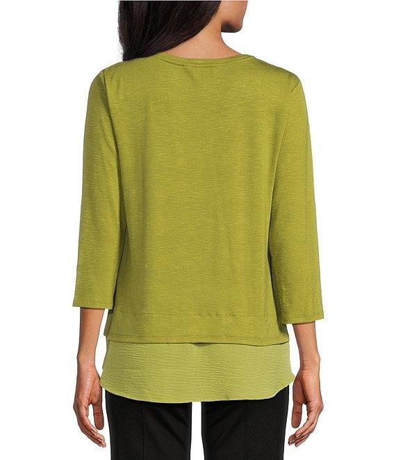 From Slim Factor by Investments, this top features: Solid slub jersey/solid crinkle crepe fabrication V-neckline 3/4 sleeves Pullover construction Polyester/rayon/spandex Machine wash/dry flat Imported.