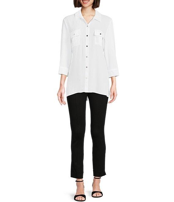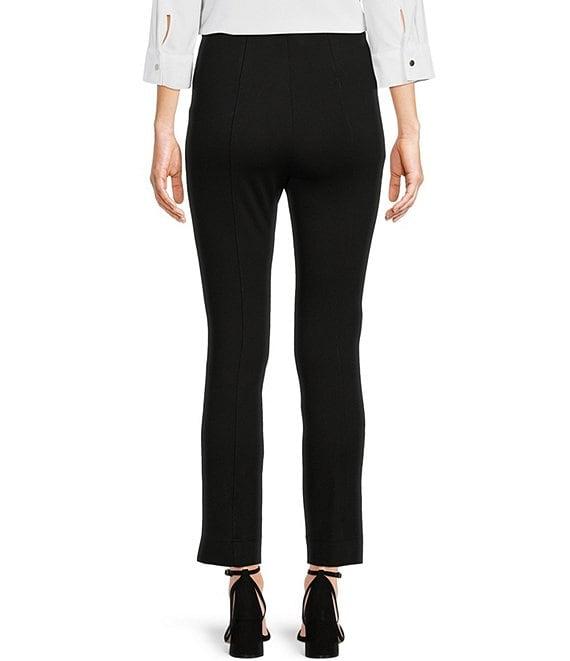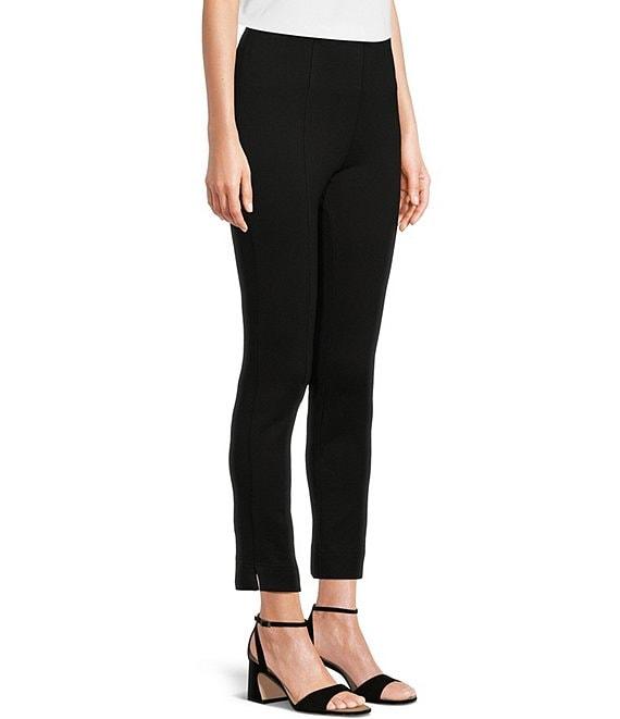 From Slim Factor by Investments, these pants feature:Ponte knit fabricFront and back leg seams contour to your body creating the appearance of an elongated legHidden compression waistband helps to slim and smooth the waist4-way stretch fabric provided comfort all daySide slit at anklePull-on Approx: 26.5" inseamRayon/nylon/spandexMachine wash/line dry Imported.