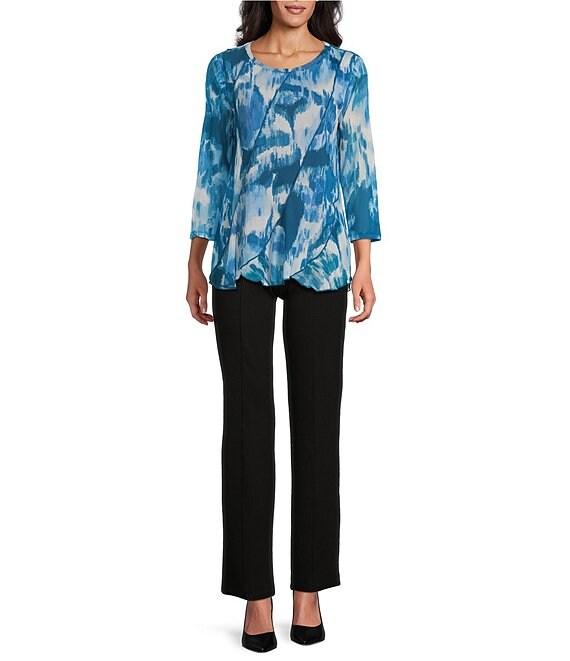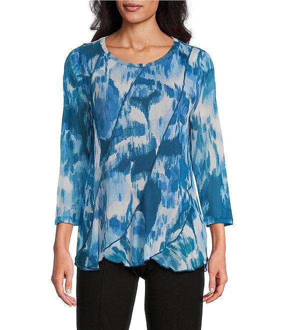 From Slim Factor by Investments, this top features: Printed mesh fabrication Blur print Crew neckline Ruffled hem Long sleeves Knit liner Pullover construction Polyester/spandex Machine wash/tumble dry Imported.