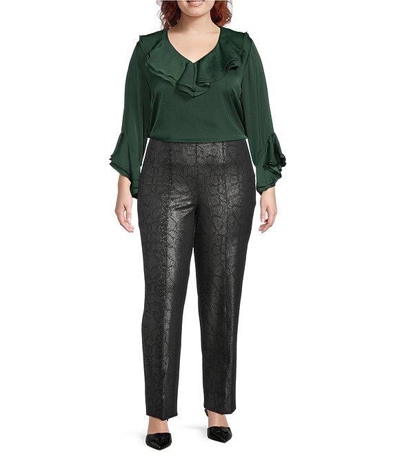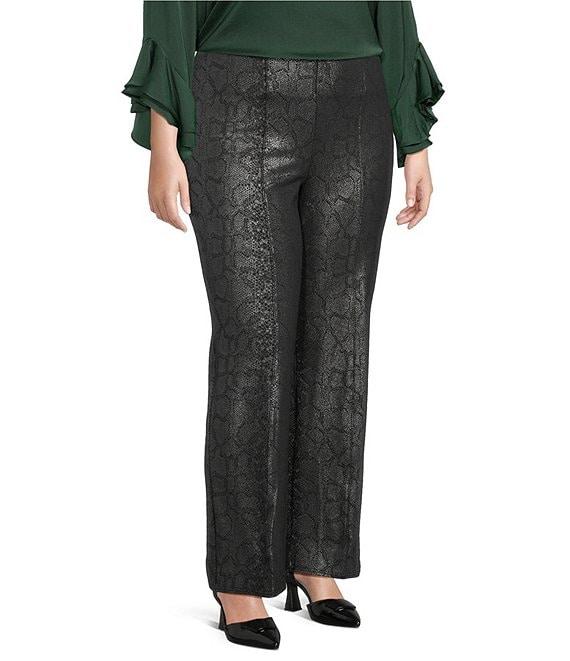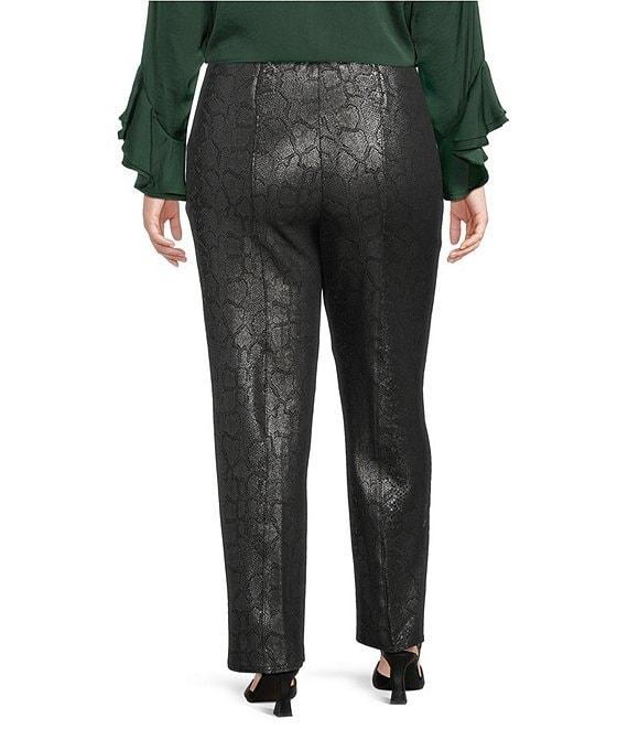 From Slim Factor by Investments Plus, these pants feature: Novelty ponte knit fabrication Straight leg silhouette Front and back leg seams contour to your body creating the appearance of an elongated leg Hidden compression waistband helps to slim and smooth the waist 4-way stretch fabric provides comfort all day Pull-on construction Approx: 30" regular inseam; 28" short inseam Rayon/nylon/spandex Hand wash Imported.