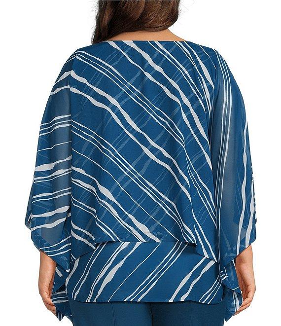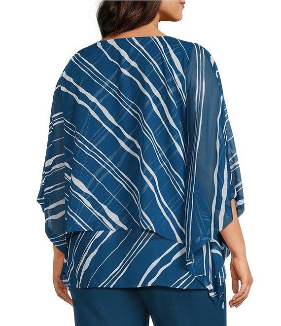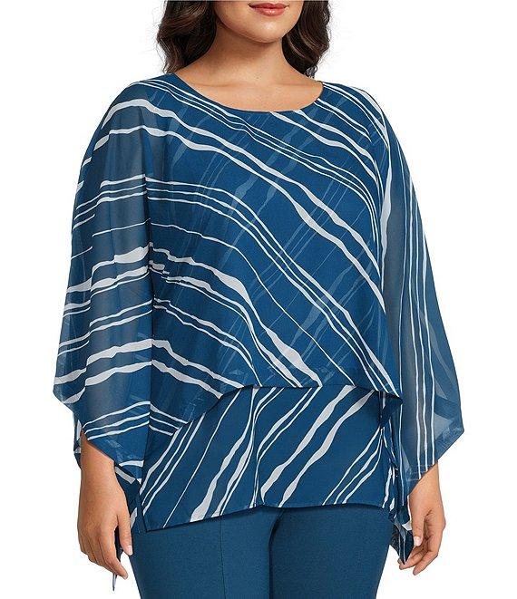 Slim Factor by Investments Plus Size Stripe Chiffon 3/4 Sleeve Crew Neck Double Layer Top