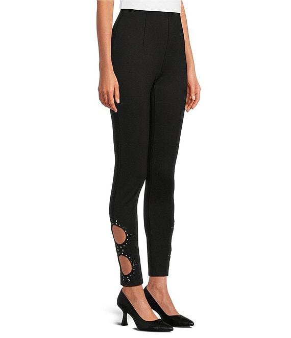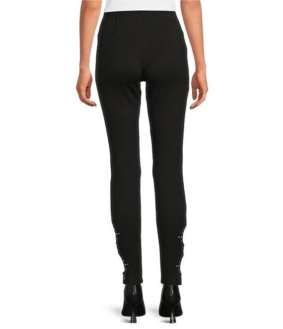 From Slim Factor by Investments, these leggings feature: Ponte knit fabrication 4-way stretch fabric provides comfort all-day Elastic waistband helps to slim and flatter the body Back yoke helps to lift and shape your curves Gentle compression that slims, smooths, and elongates the leg Clear rhinestones and cut out detail Pull-on construction Approx. 27" inseam Rayon/nylon/spandex Machine wash/line dry Imported.