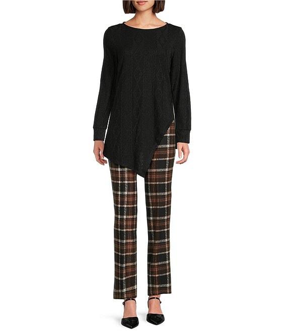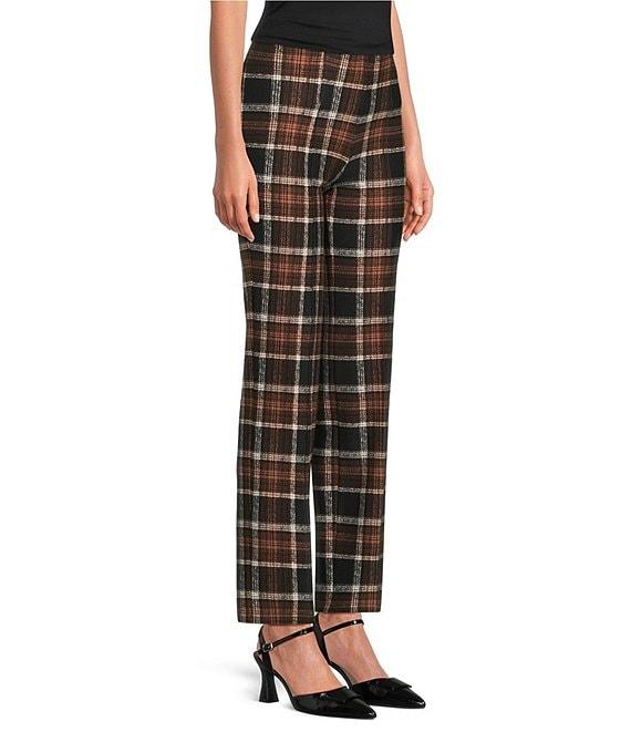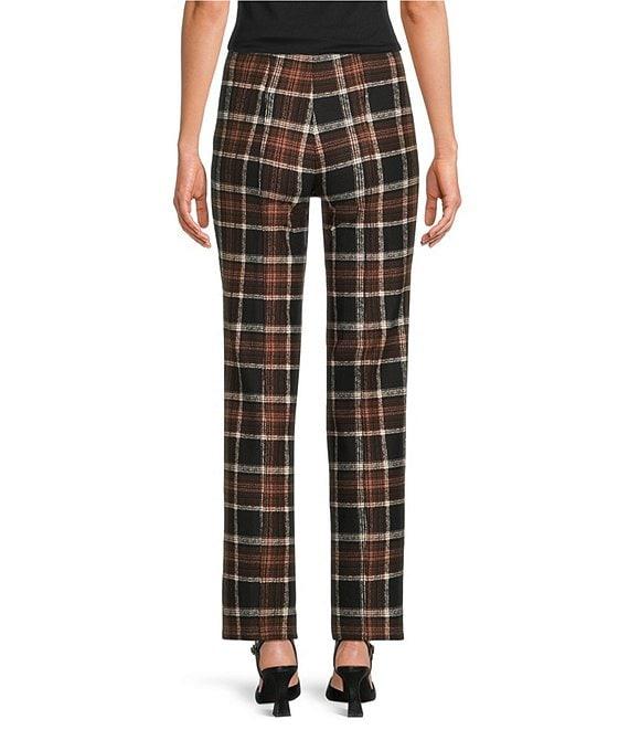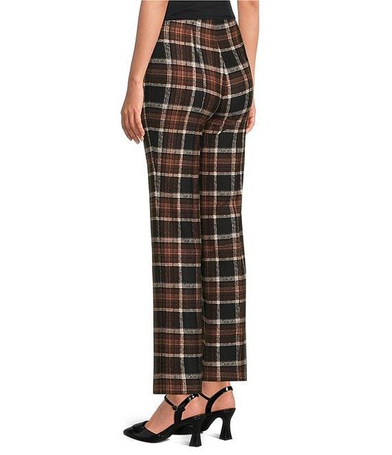 From Slim Factor by Investments, these pants feature: Ponte knit fabrication Straight leg silhouette Sketch plaid print Front and back leg seams contour to your body creating the appearance of an elongated leg Hidden compression waistband helps to slim and smooth the waist 4-way stretch fabric provides comfort all day Pull-on construction Approx: 30" regular inseam; 28" short inseam Rayon/nylon/spandex Machine wash Imported.