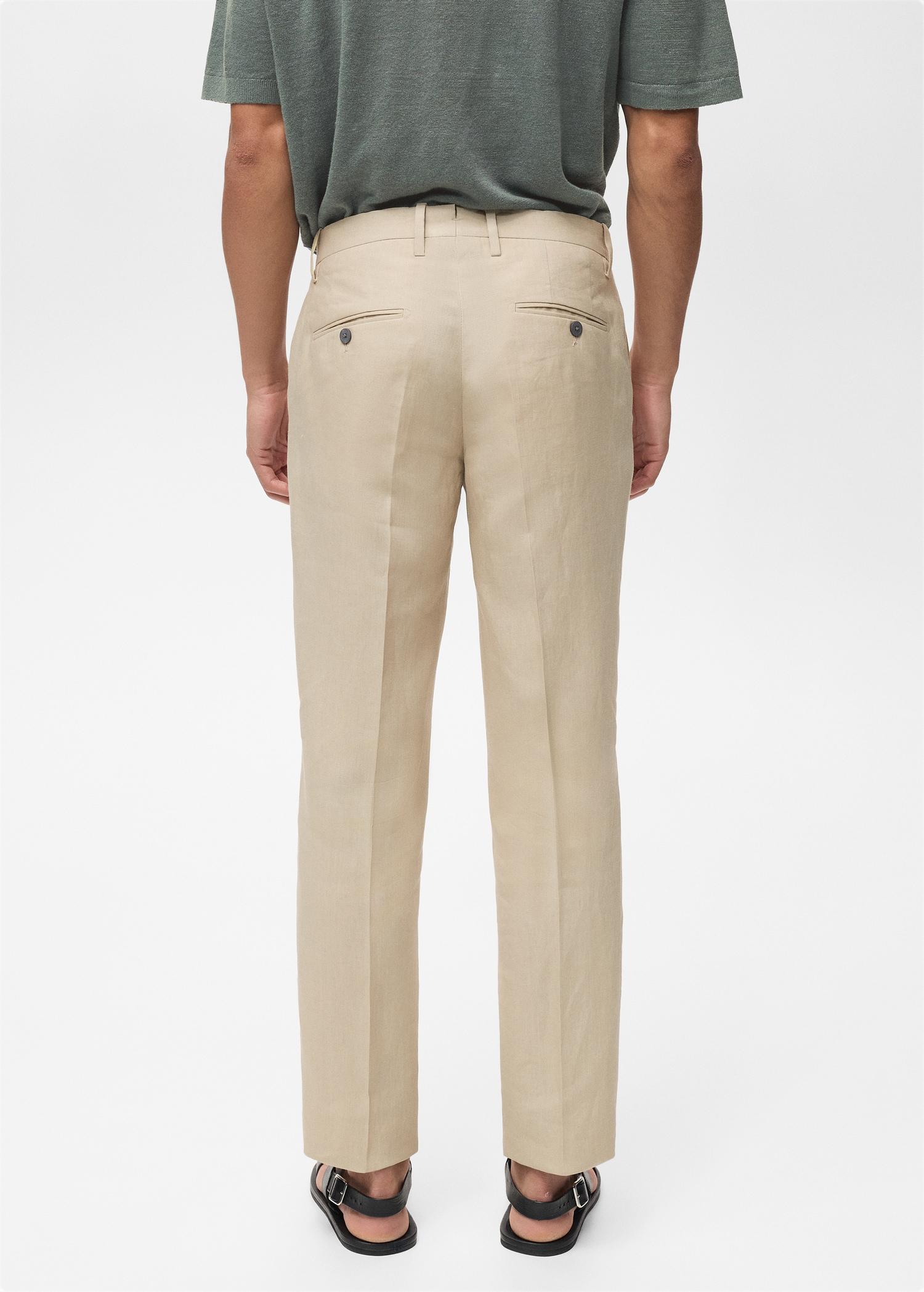 Slim fit. 100% linen fabric. Tailoring collection. Belt loops. Front closure with double-breasted buttons and zipper. Two side pockets. Two welt pockets and button on the back. Ironed stripe detail at front and back. The model is 6'1" and is wearing a size 40. Inside leg measurement 31.77 in. Side length 42.91 in. A collection of classic garments with minimalist lines and carefully designed to detail, made with high quality fabrics for a timeless and stylish closet.