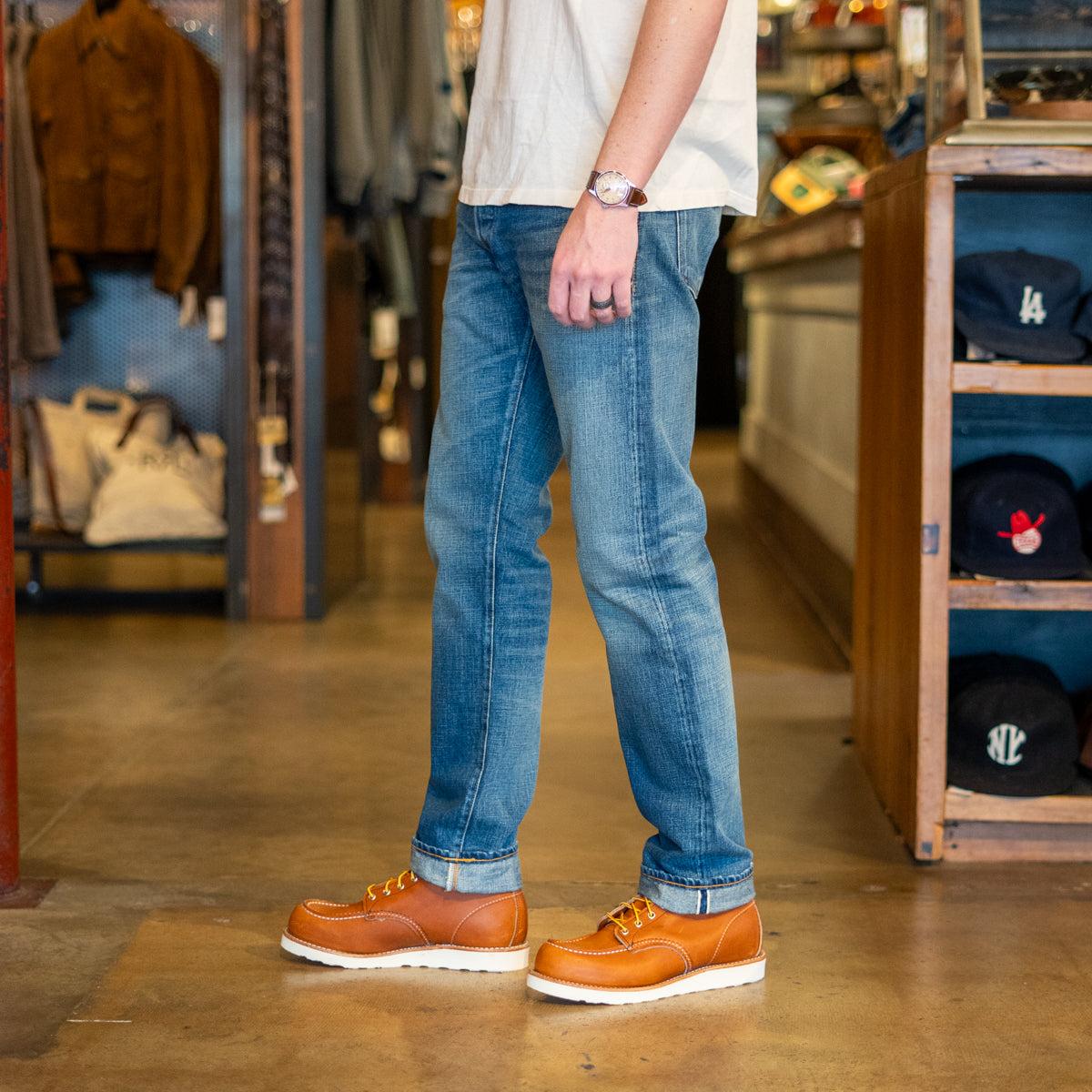 This pair of Slim Fit Jeans from Double RL is made in America from an exclusive lightweight 11.3oz selvedge denim that’s woven in Japan and hand-distressed for a vintage look and feel. They have a medium-low rise with a slim fit through the thigh and have a hand-set, chain-stitched waistband with inserted belt loops for added durability. Finished with American-made buttons, rivets and washer burrs, a leather debossed “RRL” logo patch, and classic five-pocket styling. 11.3oz Japanese selvedge denim High-contrast indigo rinse with hand-distressed finish 5-pocket styling Sanforized to minimize shrinkage Hand-set, chain-stitched waistband with inserted belt loops Button fly with RRL signature buttoned top closure “RRL” embroidery at the coin pocket Natural twill pocket lining “RRL” embossed belt loop tab Slim fit with a medium-low rise, slim thigh, and lower leg We recommend taking your normal size Made in USAMaterials: 100% cotton The following measurements are for size 32: Rise: 9” | Leg opening: 14 ½” | Thigh: 11” | Inseam 32”