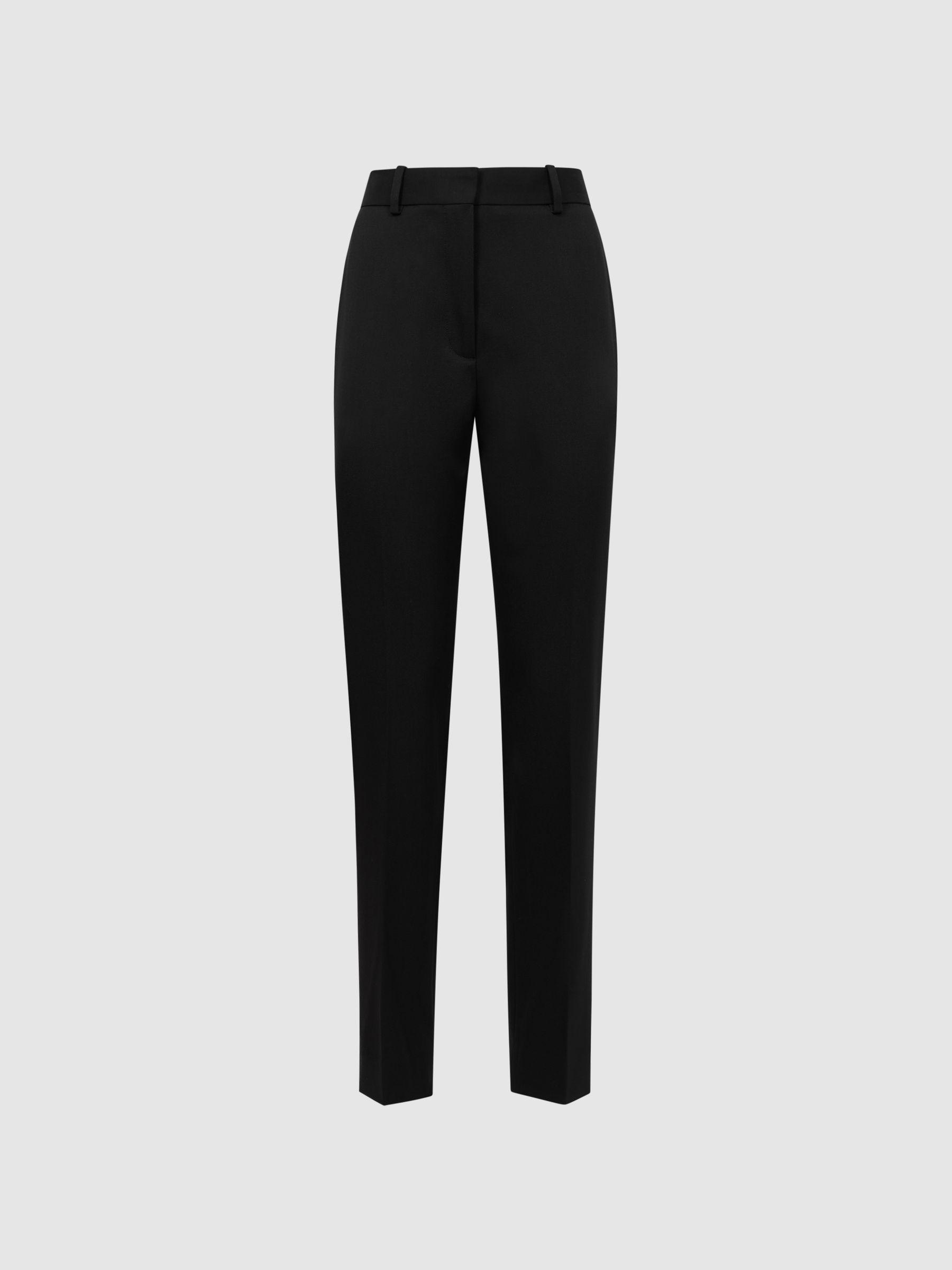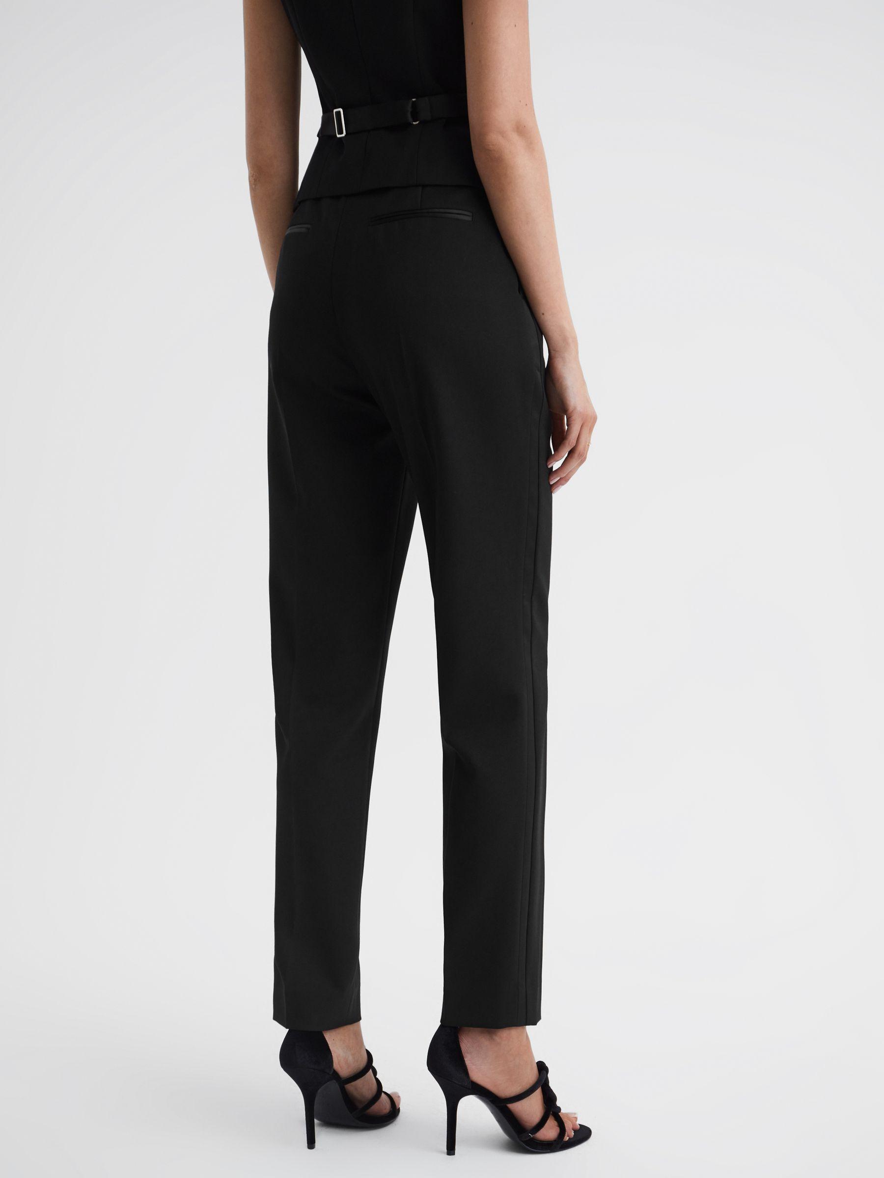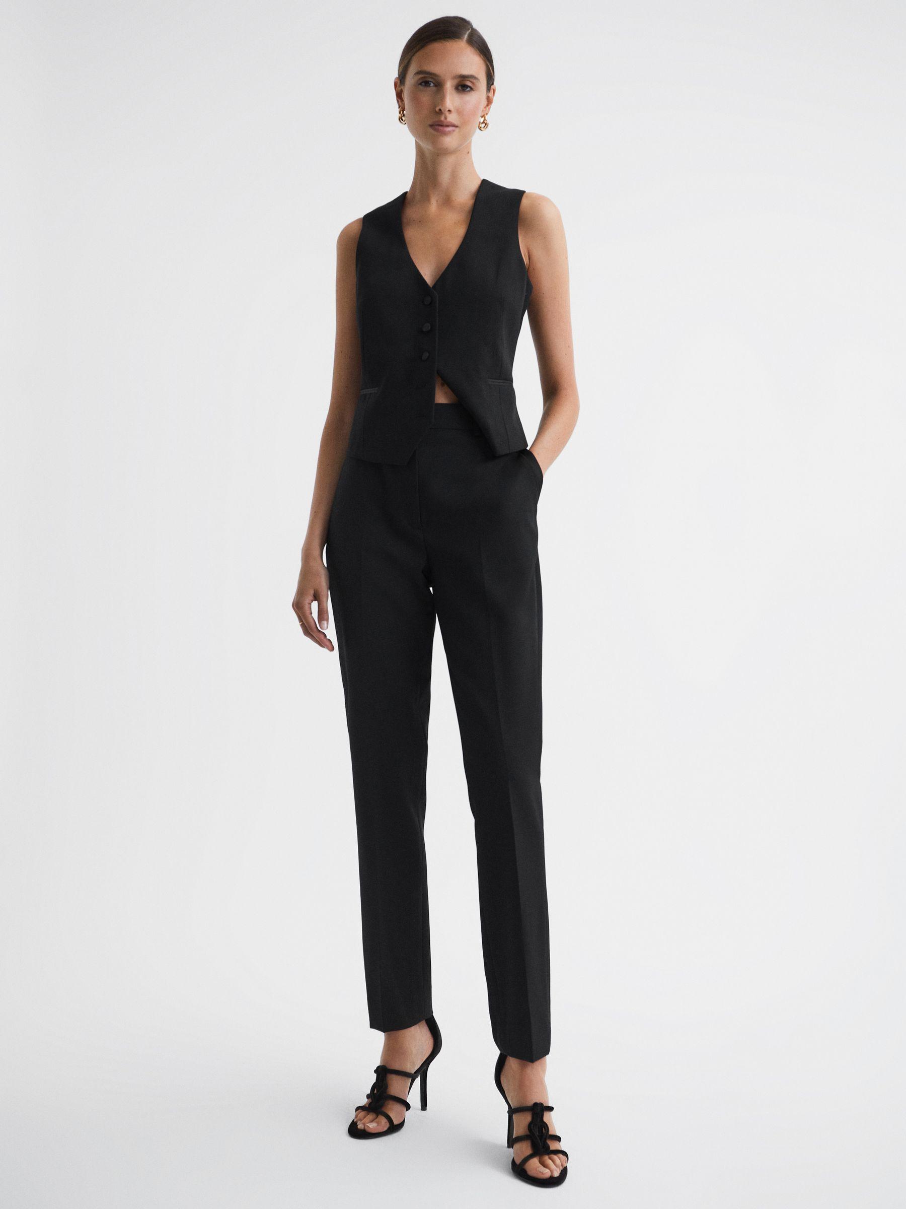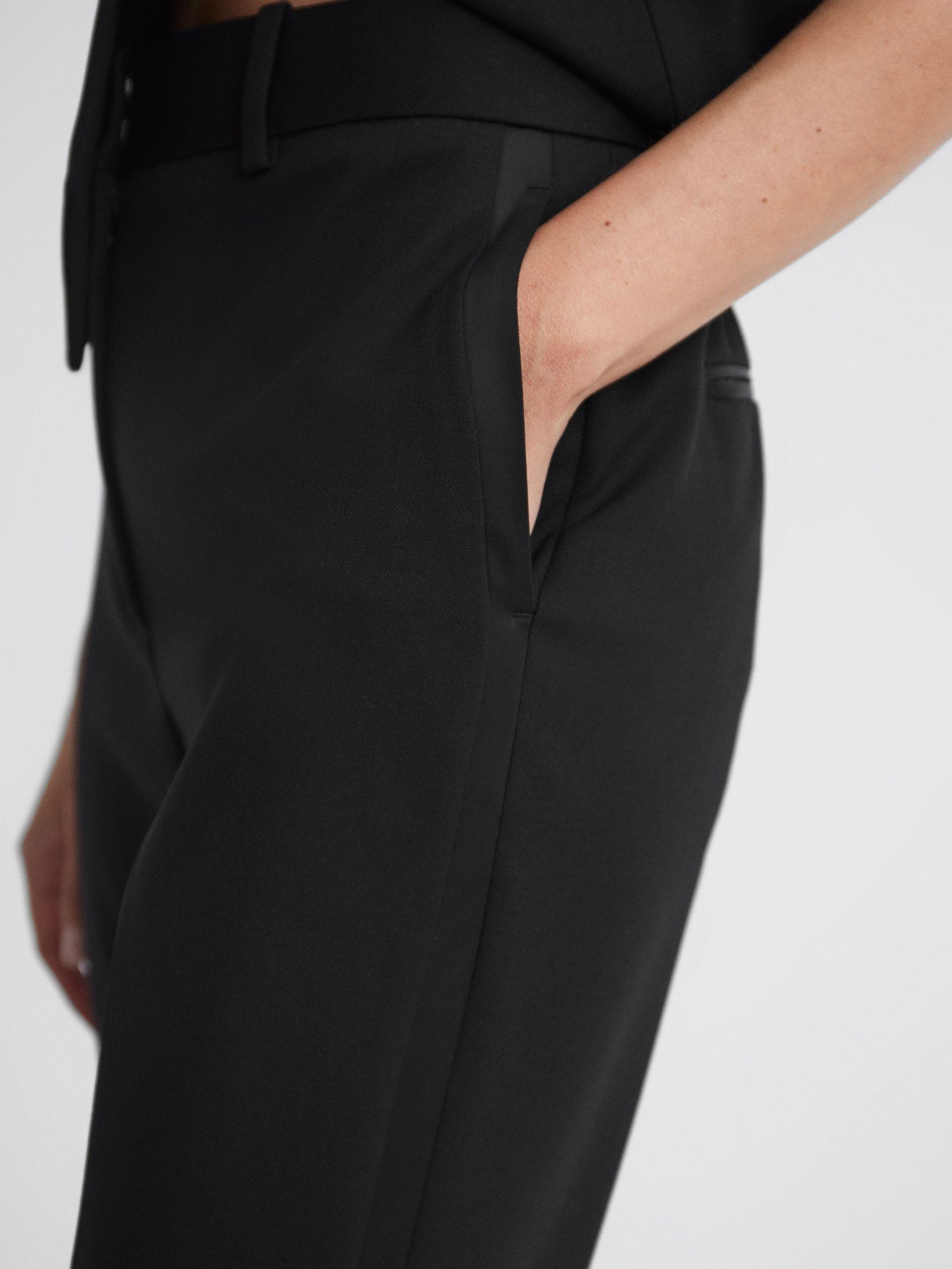 Tux-inspired styling gets a feminine update with the black Alia trousers, rendered here with satin side stripes and jetted pockets. They’re designed to sit medium-high on the hips, and they skim the frame through to a slim finish. Style for modern occasion dress-codes with the co-ordinating waistcoat. Wool blend Mid rise Satin side stripes Side-slip pockets Satin jetted pockets to reverse Slim fit