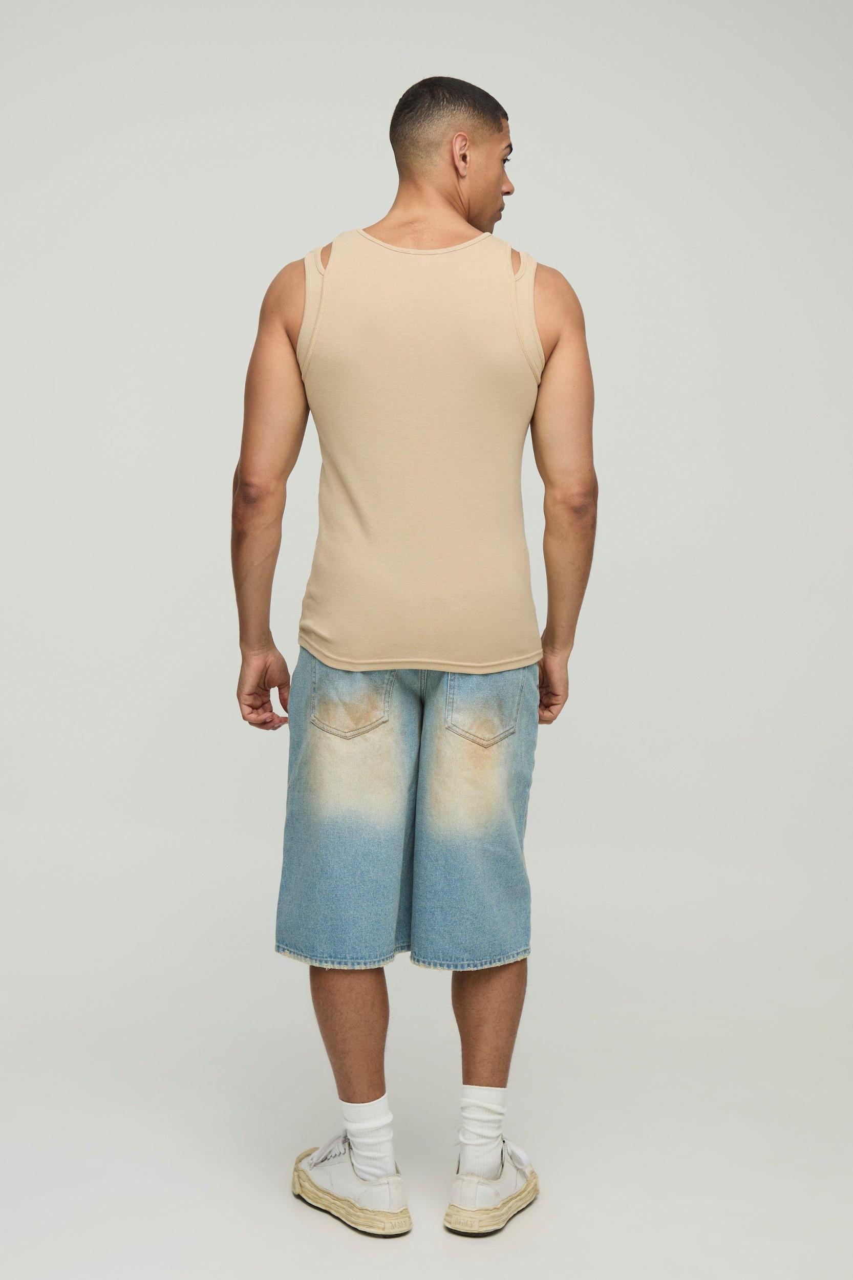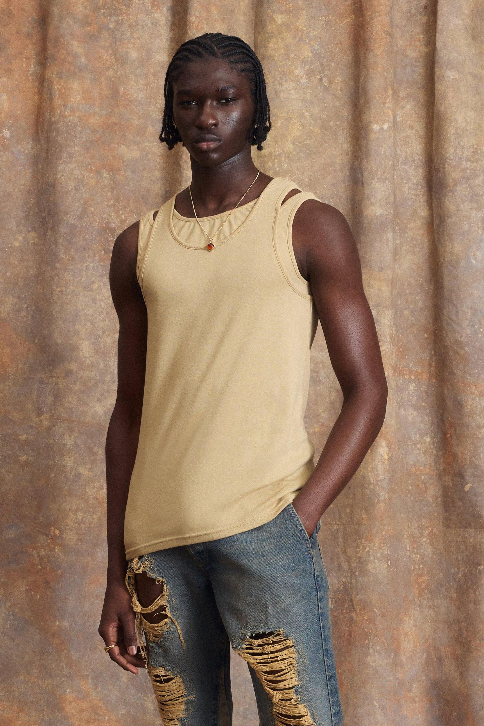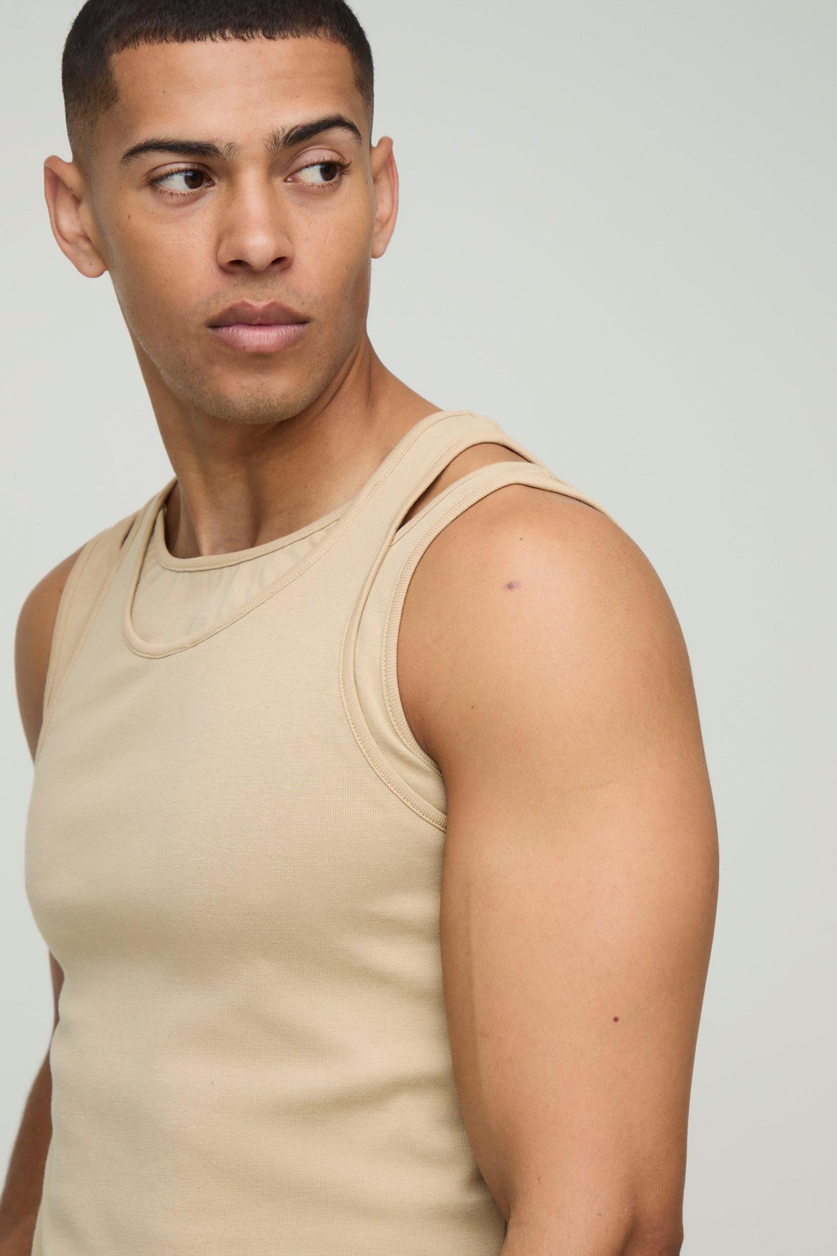 Mens Beige Slim Fit Strap Detail Jersey Vest - We all know about t-shirts and vests, light layers which have stood the test of time. T-shirts are a seasonless staple which gives your wardrobe a solid foundation to build off. Whether youre about a plain tee, printed, striped or long-sleeve or youre flexing something oversized for a comfortably casual look, make sure your outfits have the foundations they need with our range of tees and vests. Combine a plain white tee with denim and trainers for a versatile everyday outfit or pair with cropped trousers to secure minimalistic vibes.
