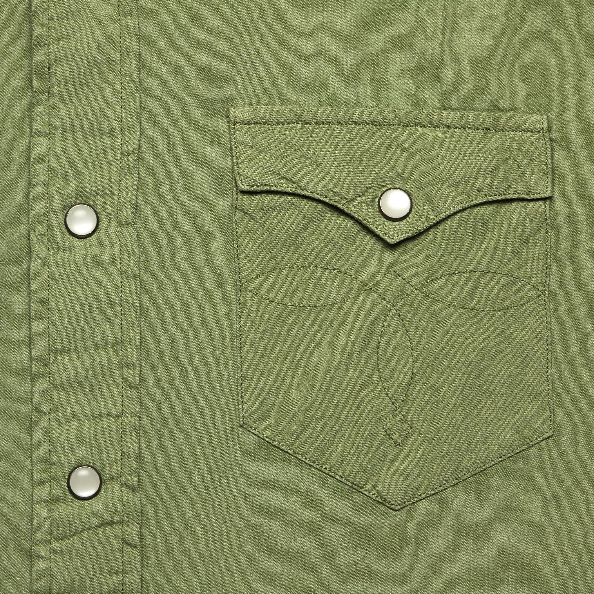 Western-style construction Point collar Applied snapped placket with Western high-rim snaps Snapped barrel cuffs with a multi-stitched reinforced inner cuff Curved hem Western-seamed yoke and shoulders Snapped flap pockets at the chest feature RRL’s signature boot stitch Slim fit