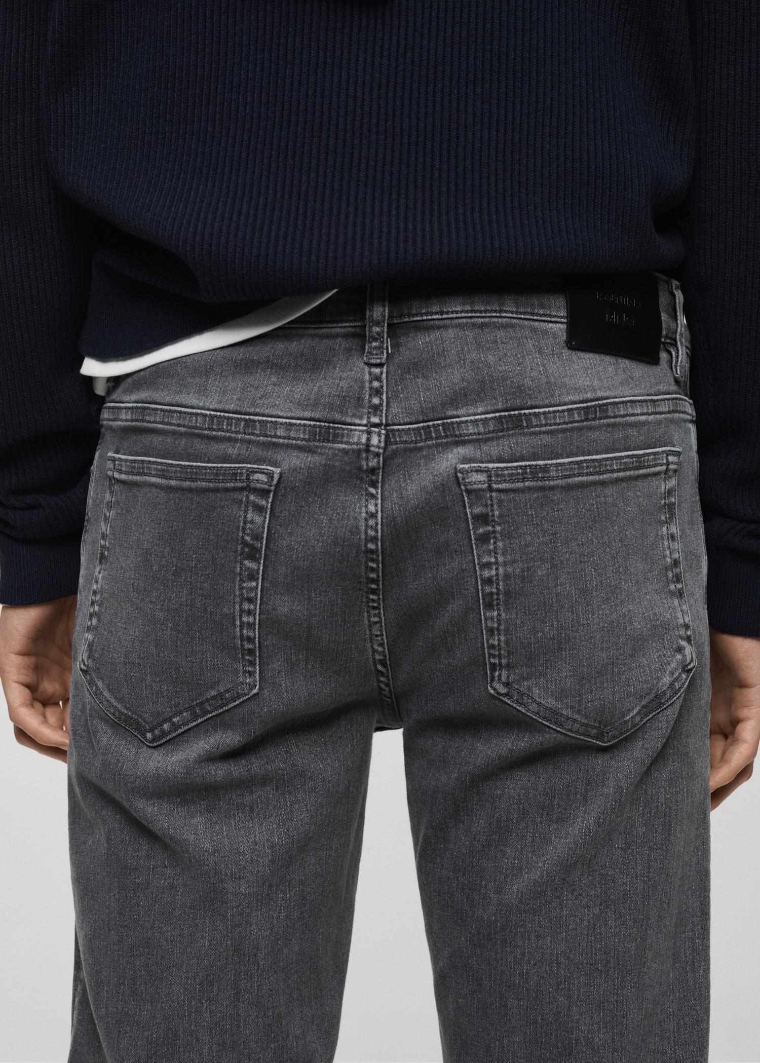 Slim fit. Grey. Recycled cotton-blend fabric. Soft fabric. Medium waist. Belt loops. Zip and one button fastening. Two side pockets. Coin pocket. Two patch pockets on the back. The model is 6'1" and is wearing a size 42. Inside leg measurement 31.97 in. Side length 42.52 in
