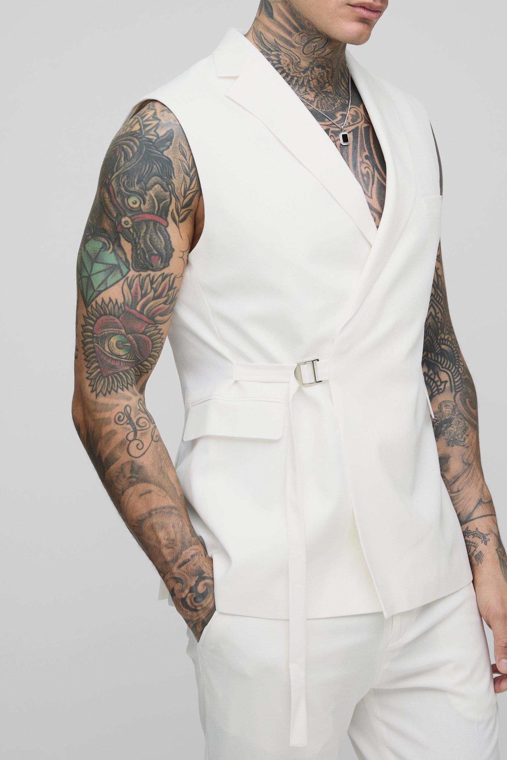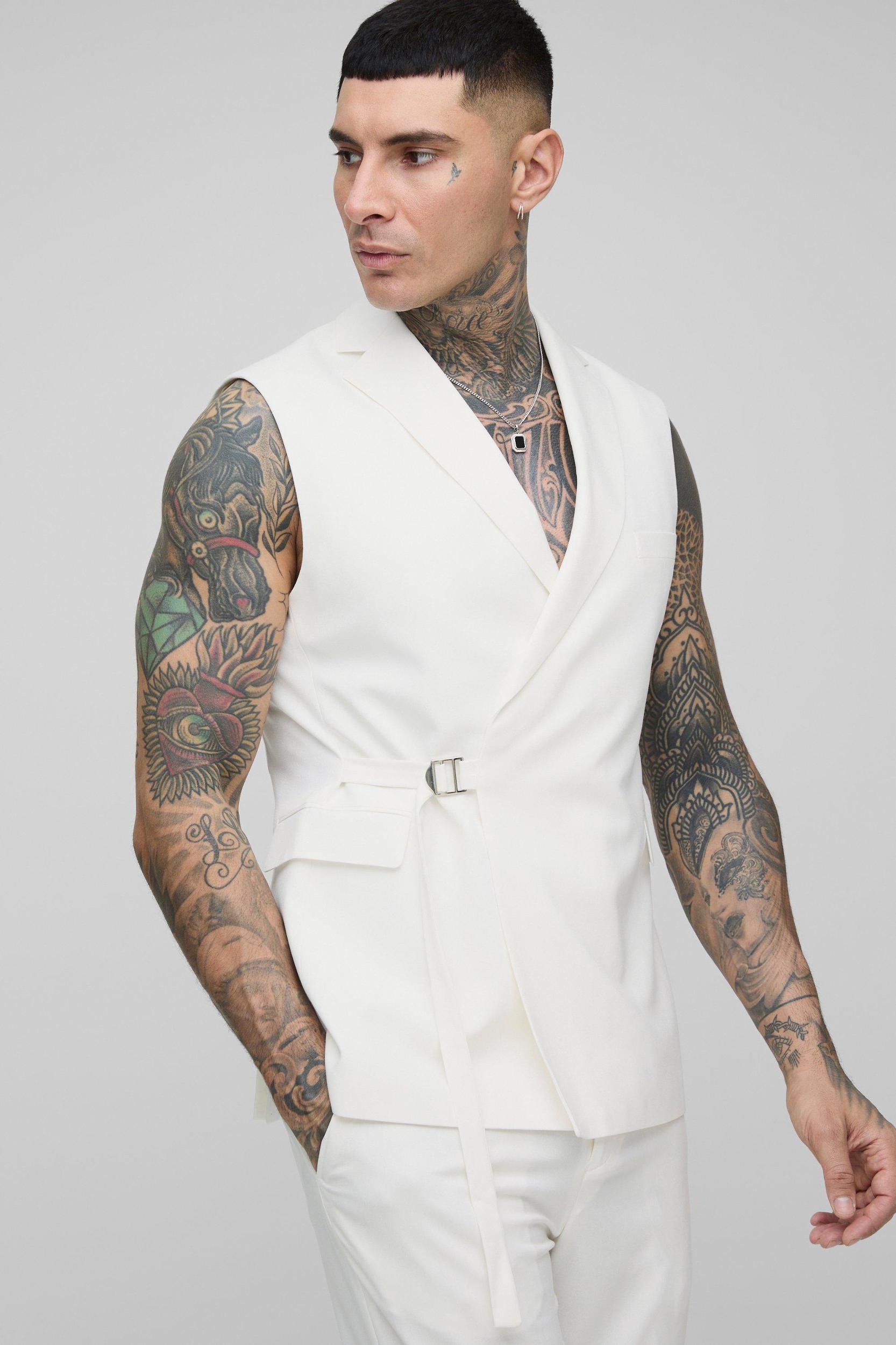 Mens White Slim Fit Wrap Detail Sleeveless Suit Jacket - Slim Fit Wrap Detail Sleeveless Suit Jacket