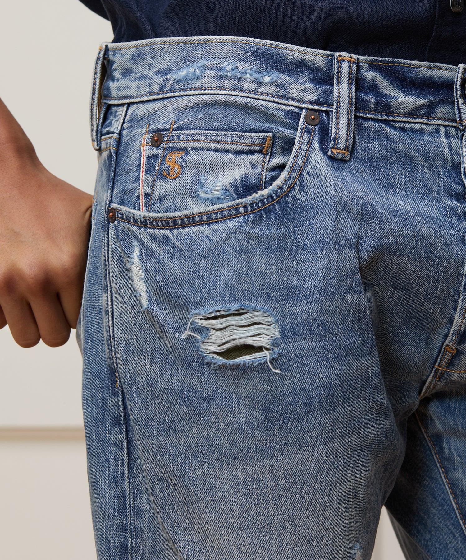 Our denim comes in distinct categories (Stretch, Selvedge and Small Batch), for the same reason that sometimes you want an artisanal sipping whiskey, and others a draft beer. The Selvedge jeans are 100% cotton (and 100% classic) loaded with quality details including a shank button fly, oxidized rivets, chain-stitched embroidery, a selvedge locker loop inside the back waist and selvedge outseams. So when you turn up the cuff, you’ll see the giveaway red ticking on the edge. Our Destroyed Wash is a mid-blue denim but baked and sanded to simulate the effect of years of natural wear-and-tear with abrasions and holes popping up where they typically would. A perfect warm-weather jean. 100% cotton Genuine Selvedge 14-inch cuff opening Shank button fly Classic 5-pocket construction Antique rivets Chain-stitched embroidery Made in Vietnam Machine Wash JE039242